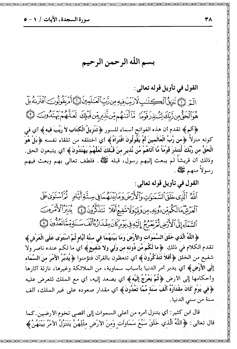 الم (1) تَنْزِيلُ الْكِتابِ لا رَيْبَ فِيهِ مِنْ رَبِّ الْعالَمِينَ (2) أَمْ يَقُولُونَ افْتَراهُ بَلْ هُوَ الْحَقُّ مِنْ رَبِّكَ لِتُنْذِرَ قَوْماً ما أَتاهُمْ مِنْ نَذِيرٍ مِنْ قَبْلِكَ لَعَلَّهُمْ يَهْتَدُونَ (3)
