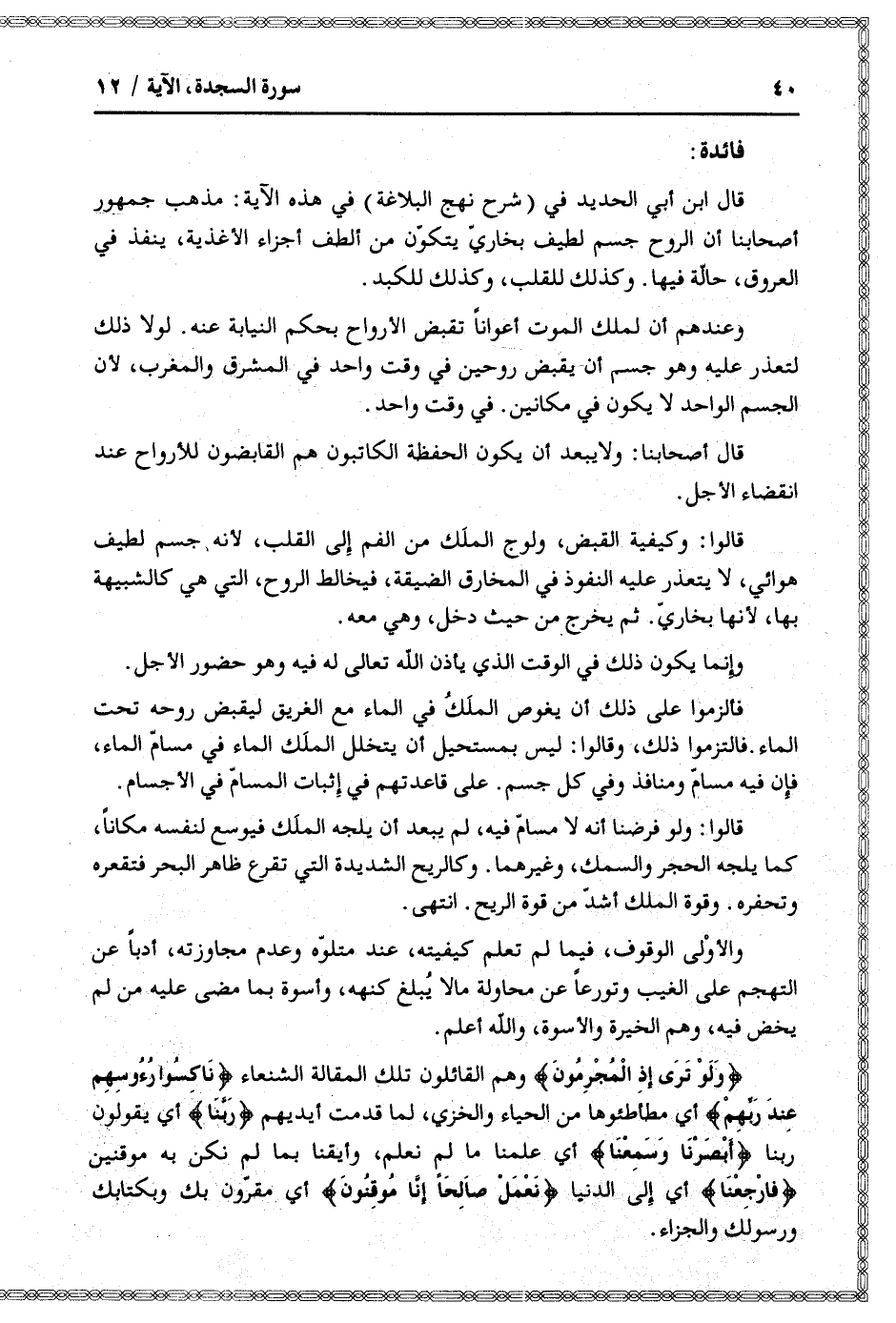 قال ابن أبي الحديد في (شرح نهج البلاغة) في هذه الآية: مذهب جمهور أصحابنا أن الروح جسم لطيف بخاريّ يتكوّن من ألطف أجزاء الأغذية، ينفذ في العروق، حالّة فيها. وكذلك للقلب، وكذلك للكبد.