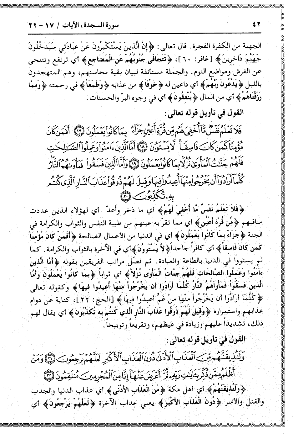 فَلا تَعْلَمُ نَفْسٌ ما أُخْفِيَ لَهُمْ مِنْ قُرَّةِ أَعْيُنٍ جَزاءً بِما كانُوا يَعْمَلُونَ (17) أَفَمَنْ كانَ مُؤْمِناً كَمَنْ كانَ فاسِقاً لا يَسْتَوُونَ (18) أَمَّا الَّذِينَ آمَنُوا وَعَمِلُوا الصَّالِحاتِ فَلَهُمْ جَنَّاتُ الْمَأْوى نُزُلاً بِما كانُوا يَعْمَلُونَ (19) وَأَمَّا الَّذِينَ فَسَقُوا فَمَأْواهُمُ النَّارُ كُلَّما أَرادُوا أَنْ يَخْرُجُوا مِنْها أُعِيدُوا فِيها وَقِيلَ لَهُمْ ذُوقُوا عَذابَ النَّارِ الَّذِي كُنْتُمْ بِهِ تُكَذِّبُونَ (20)