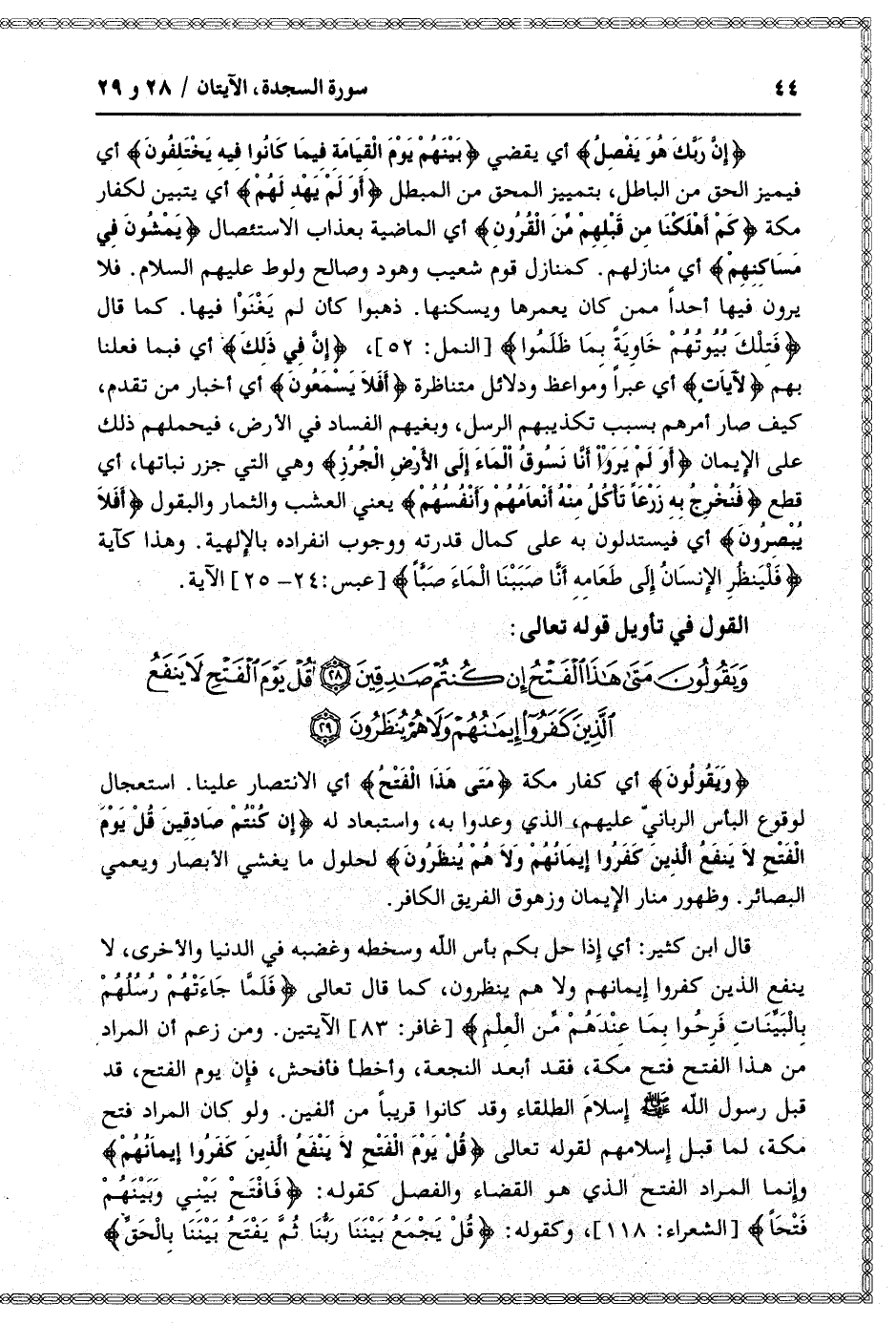 القول في تأويل قوله تعالى: [سورة السجده (32) : الآيات 28 الى 29]