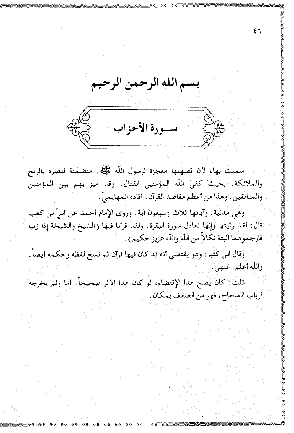 وهي مدنية. وآياتها ثلاث وسبعون آية. وروى الإمام أحمد عن أبيّ بن كعب قال: لقد رأيتها وإنها تعادل سورة البقرة. ولقد قرأنا فيها (الشيخ والشيخة إذا زنيا فارجموهما البتة نكالا من الله والله عزيز حكيم) .
