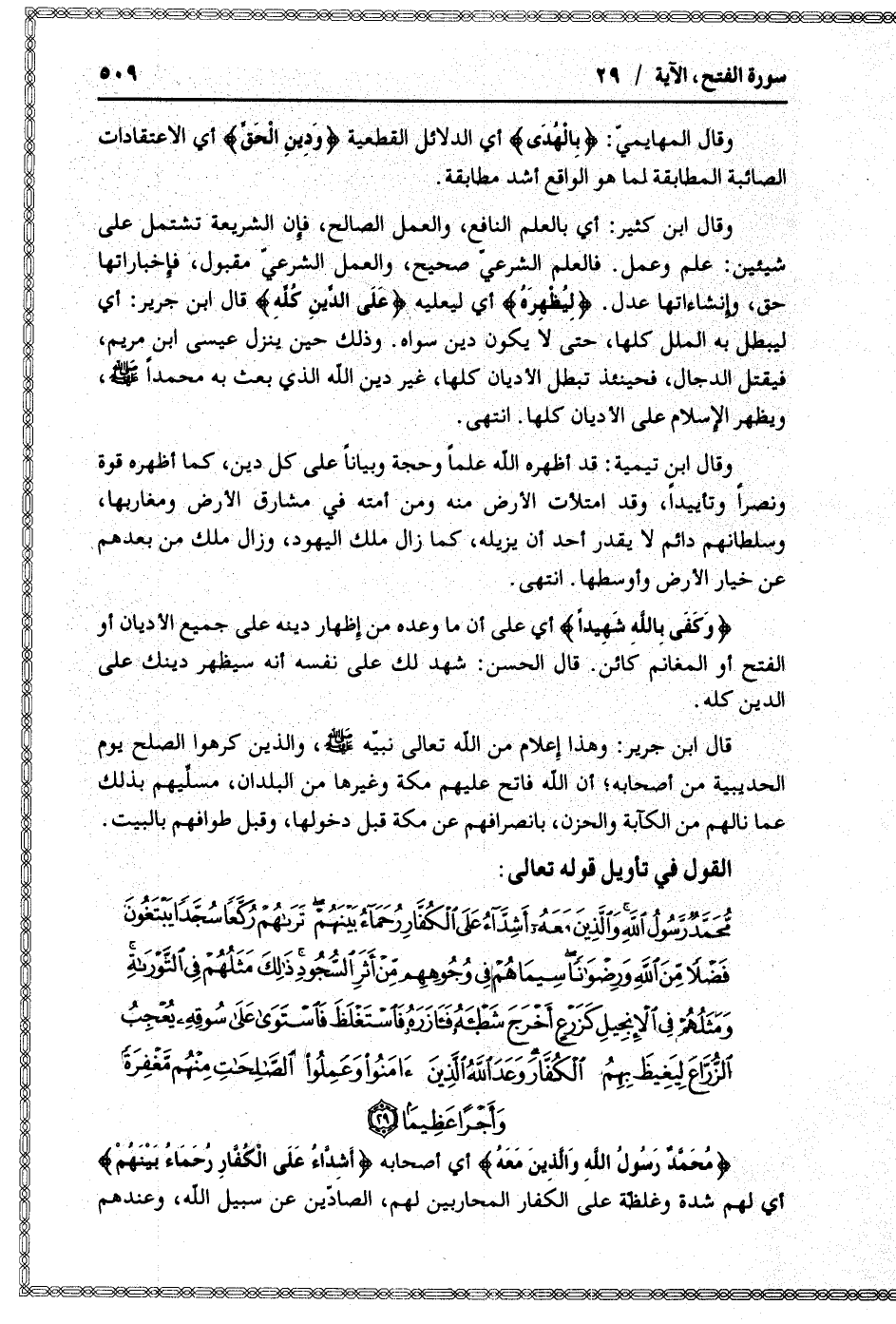 مُحَمَّدٌ رَسُولُ اللَّهِ وَالَّذِينَ مَعَهُ أَشِدَّاءُ عَلَى الْكُفَّارِ رُحَماءُ بَيْنَهُمْ تَراهُمْ رُكَّعاً سُجَّداً يَبْتَغُونَ فَضْلاً مِنَ اللَّهِ وَرِضْواناً سِيماهُمْ فِي وُجُوهِهِمْ مِنْ أَثَرِ السُّجُودِ ذلِكَ مَثَلُهُمْ فِي التَّوْراةِ وَمَثَلُهُمْ فِي الْإِنْجِيلِ كَزَرْعٍ أَخْرَجَ شَطْأَهُ فَآزَرَهُ فَاسْتَغْلَظَ فَاسْتَوى عَلى سُوقِهِ يُعْجِبُ الزُّرَّاعَ لِيَغِيظَ بِهِمُ الْكُفَّارَ وَعَدَ اللَّهُ الَّذِينَ آمَنُوا وَعَمِلُوا الصَّالِحاتِ مِنْهُمْ مَغْفِرَةً وَأَجْراً عَظِيماً (29)