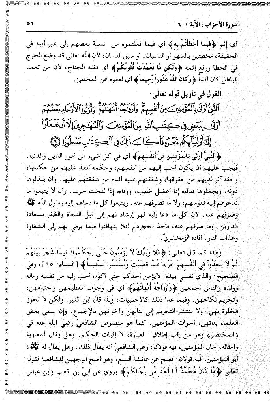 النَّبِيُّ أَوْلى بِالْمُؤْمِنِينَ مِنْ أَنْفُسِهِمْ وَأَزْواجُهُ أُمَّهاتُهُمْ وَأُولُوا الْأَرْحامِ بَعْضُهُمْ أَوْلى بِبَعْضٍ فِي كِتابِ اللَّهِ مِنَ الْمُؤْمِنِينَ وَالْمُهاجِرِينَ إِلاَّ أَنْ تَفْعَلُوا إِلى أَوْلِيائِكُمْ مَعْرُوفاً كانَ ذلِكَ فِي الْكِتابِ مَسْطُوراً (6)