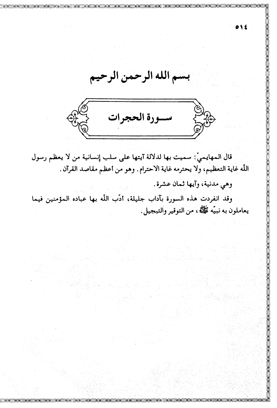 وقد انفردت هذه السورة بآداب جليلة، أدّب الله بها عباده المؤمنين فيما يعاملون به نبيّه صلّى الله عليه وسلّم، من التوقير والتبجيل.