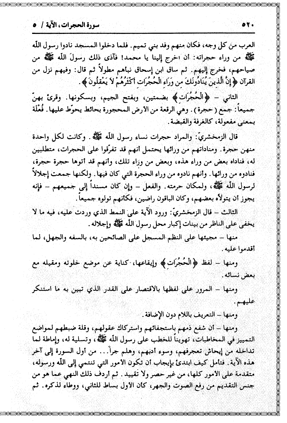 الثاني- الْحُجُراتِ بضمتين، وبفتح الجيم، وبسكونها. وقرئ بهنّ جميعا: جمع (حجرة) . وهي الرقعة من الأرض المحجورة بحائط يحوّط عليها. فعلة بمعنى مفعولة، كالغرفة والقبضة.