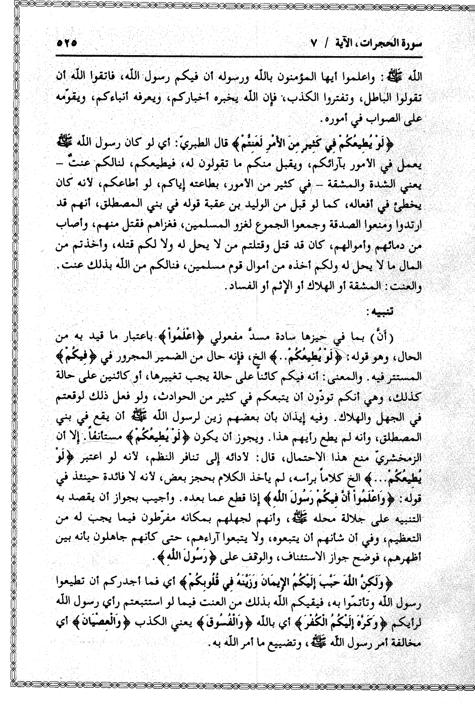 لَوْ يُطِيعُكُمْ فِي كَثِيرٍ مِنَ الْأَمْرِ لَعَنِتُّمْ قال الطبريّ: أي لو كان رسول الله صلّى الله عليه وسلّم يعمل في الأمور بآرائكم، ويقبل منكم ما تقولون له، فيطيعكم، لنالكم عنت- يعني الشدة والمشقة- في كثير من الأمور، بطاعته إياكم، لو أطاعكم، لأنه كان يخطئ في أفعاله، كما لو قبل من الوليد بن عقبة قوله في بني المصطلق، أنهم قد ارتدوا ومنعوا الصدقة وجمعوا الجموع لغزو المسلمين، فغزاهم فقتل منهم، وأصاب من دمائهم وأموالهم، كان قد قتل وقتلتم من لا يحل له ولا لكم قتله، وأخذتم من المال ما لا يحل له ولكم أخذه من أموال قوم مسلمين، فنالكم من الله بذلك عنت.