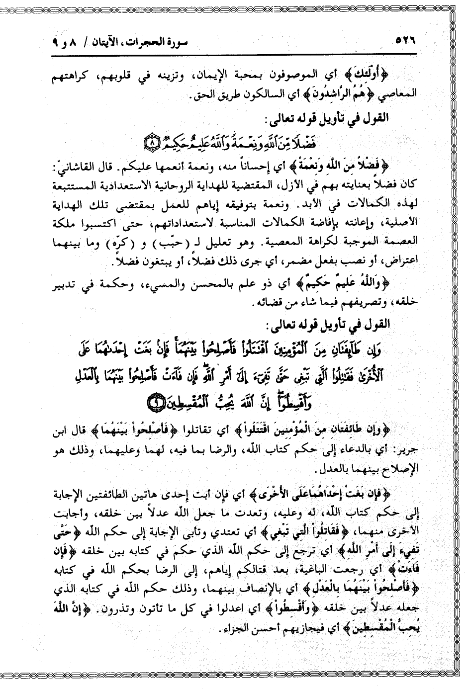 وَإِنْ طائِفَتانِ مِنَ الْمُؤْمِنِينَ اقْتَتَلُوا فَأَصْلِحُوا بَيْنَهُما فَإِنْ بَغَتْ إِحْداهُما عَلَى الْأُخْرى فَقاتِلُوا الَّتِي تَبْغِي حَتَّى تَفِيءَ إِلى أَمْرِ اللَّهِ فَإِنْ فاءَتْ فَأَصْلِحُوا بَيْنَهُما بِالْعَدْلِ وَأَقْسِطُوا إِنَّ اللَّهَ يُحِبُّ الْمُقْسِطِينَ (9)