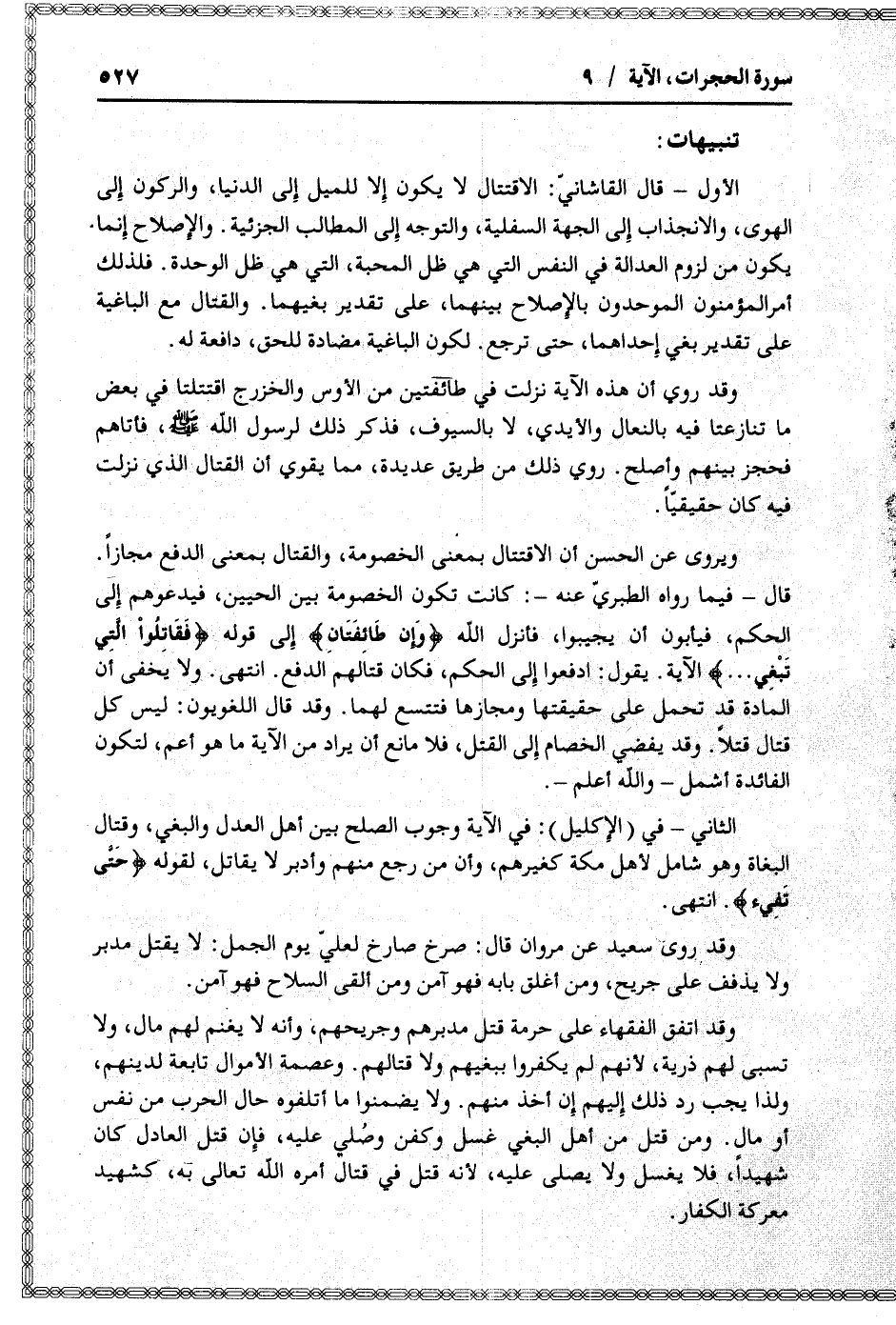 الثاني- في (الإكليل) : في الآية وجوب الصلح بين أهل العدل والبغي، وقتال البغاة وهو شامل لأهل مكة كغيرهم، وأن من رجع منهم وأدبر لا يقاتل، لقوله حَتَّى تَفِيءَ. انتهى.