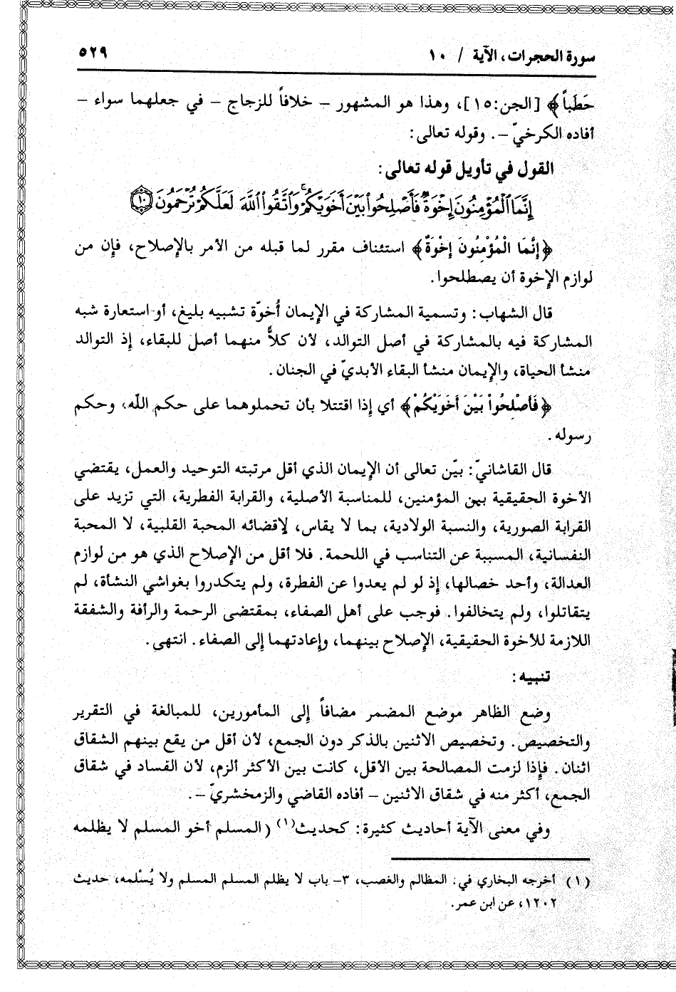 قال القاشانيّ: بيّن تعالى أن الإيمان الذي أقل مرتبته التوحيد والعمل، يقتضي الأخوة الحقيقية بين المؤمنين، للمناسبة الأصلية، والقرابة الفطرية، التي تزيد على القرابة الصورية، والنسبة الولادية، بما لا يقاس، لاقضائه المحبة القلبية، لا المحبة النفسانية، المسببة عن التناسب في اللحمة. فلا أقل من الإصلاح الذي هو من لوازم العدالة، وأحد خصالها، إذ لو لم يعدوا عن الفطرة، ولم يتكدروا بغواشي النشأة، لم يتقاتلوا، ولم يتخالفوا. فوجب على أهل الصفاء، بمقتضى الرحمة والرأفة والشفقة اللازمة للأخوة الحقيقية، الإصلاح بينهما، وإعادتهما إلى الصفاء. انتهى.