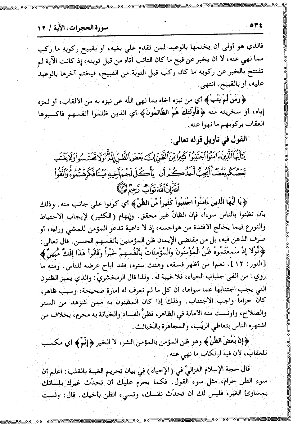 يا أَيُّهَا الَّذِينَ آمَنُوا اجْتَنِبُوا كَثِيراً مِنَ الظَّنِّ إِنَّ بَعْضَ الظَّنِّ إِثْمٌ وَلا تَجَسَّسُوا وَلا يَغْتَبْ بَعْضُكُمْ بَعْضاً أَيُحِبُّ أَحَدُكُمْ أَنْ يَأْكُلَ لَحْمَ أَخِيهِ مَيْتاً فَكَرِهْتُمُوهُ وَاتَّقُوا اللَّهَ إِنَّ اللَّهَ تَوَّابٌ رَحِيمٌ (12)