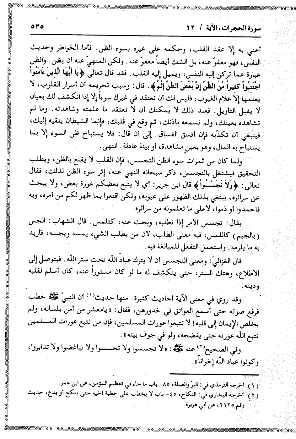 ولما كان من ثمرات سوء الظن التجسس، فإن القلب لا يقنع بالظن، ويطلب التحقيق فيشتغل بالتجسس، ذكر سبحانه النهي عنه، إثر سوء الظن لذلك، فقال تعالى: وَلا تَجَسَّسُوا قال ابن جرير: أي لا يتبع بعضكم عورة بعض، ولا يبحث عن سرائره، يبتغي بذلك الظهور على عيوبه، ولكن اقنعوا بما ظهر لكم من أمره، وبه فاحمدوا أو ذموا، لا على ما تعلمونه من سرائره.