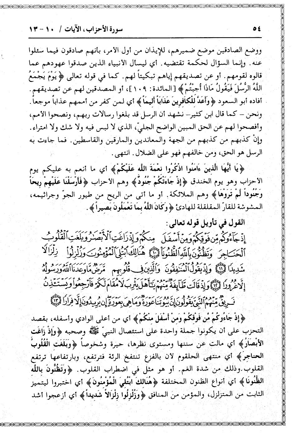 إِذْ جاؤُكُمْ مِنْ فَوْقِكُمْ وَمِنْ أَسْفَلَ مِنْكُمْ وَإِذْ زاغَتِ الْأَبْصارُ وَبَلَغَتِ الْقُلُوبُ الْحَناجِرَ وَتَظُنُّونَ بِاللَّهِ الظُّنُونَا (10) هُنالِكَ ابْتُلِيَ الْمُؤْمِنُونَ وَزُلْزِلُوا زِلْزالاً شَدِيداً (11) وَإِذْ يَقُولُ الْمُنافِقُونَ وَالَّذِينَ فِي قُلُوبِهِمْ مَرَضٌ ما وَعَدَنَا اللَّهُ وَرَسُولُهُ إِلاَّ غُرُوراً (12) وَإِذْ قالَتْ طائِفَةٌ مِنْهُمْ يا أَهْلَ يَثْرِبَ لا مُقامَ لَكُمْ فَارْجِعُوا وَيَسْتَأْذِنُ فَرِيقٌ مِنْهُمُ النَّبِيَّ يَقُولُونَ إِنَّ بُيُوتَنا عَوْرَةٌ وَما هِيَ بِعَوْرَةٍ إِنْ يُرِيدُونَ إِلاَّ فِراراً (13)