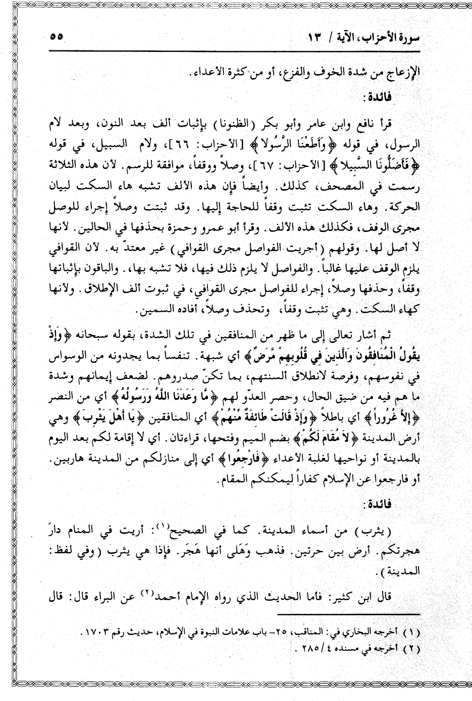 ثم أشار تعالى إلى ما ظهر من المنافقين في تلك الشدة، بقوله سبحانه وَإِذْ يَقُولُ الْمُنافِقُونَ وَالَّذِينَ فِي قُلُوبِهِمْ مَرَضٌ أي شبهة. تنفسا بما يجدونه من الوسواس في نفوسهم، وفرصة لانطلاق ألسنتهم، بما تكنّ صدورهم. لضعف إيمانهم وشدة ما هم فيه من ضيق الحال، وحصر العدوّ لهم ما وَعَدَنَا اللَّهُ وَرَسُولُهُ أي من النصر إِلَّا غُرُوراً أي باطلا وَإِذْ قالَتْ طائِفَةٌ مِنْهُمْ أي المنافقين يا أَهْلَ يَثْرِبَ وهي أرض المدينة لا مُقامَ لَكُمْ بضم الميم وفتحها، قراءتان. أي لا إقامة لكم بعد اليوم بالمدينة أو نواحيها لغلبة الأعداء فَارْجِعُوا أي إلى منازلكم من المدينة هاربين.