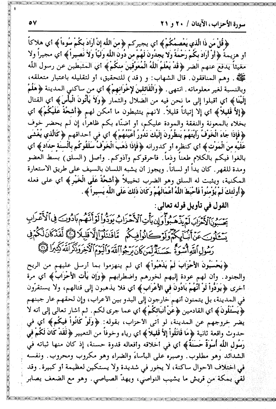 يَحْسَبُونَ الْأَحْزابَ لَمْ يَذْهَبُوا وَإِنْ يَأْتِ الْأَحْزابُ يَوَدُّوا لَوْ أَنَّهُمْ بادُونَ فِي الْأَعْرابِ يَسْئَلُونَ عَنْ أَنْبائِكُمْ وَلَوْ كانُوا فِيكُمْ ما قاتَلُوا إِلاَّ قَلِيلاً (20) لَقَدْ كانَ لَكُمْ فِي رَسُولِ اللَّهِ أُسْوَةٌ حَسَنَةٌ لِمَنْ كانَ يَرْجُوا اللَّهَ وَالْيَوْمَ الْآخِرَ وَذَكَرَ اللَّهَ كَثِيراً (21)