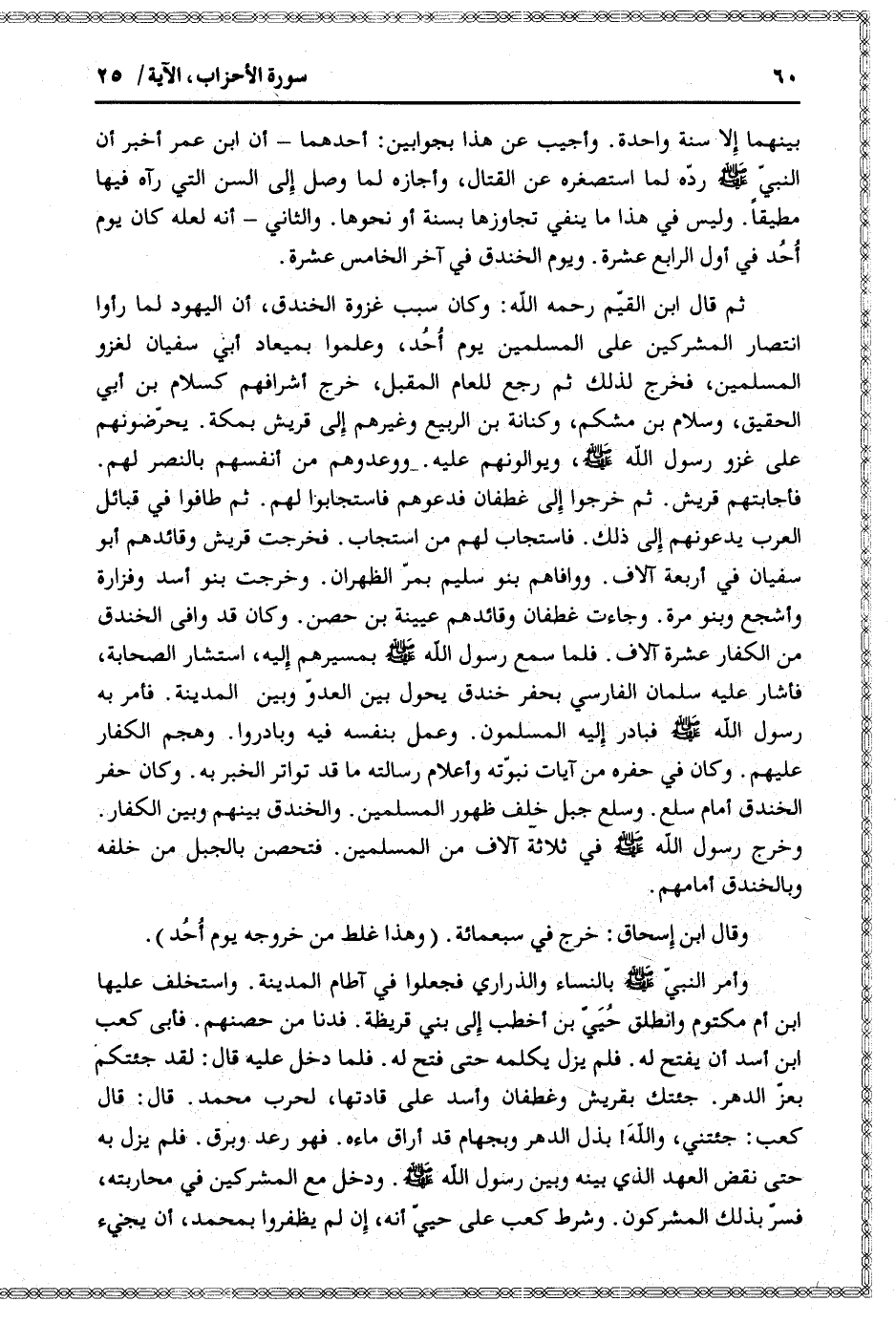 ثم قال ابن القيّم رحمه الله: وكان سبب غزوة الخندق، أن اليهود لما رأوا انتصار المشركين على المسلمين يوم أحد، وعلموا بميعاد أبي سفيان لغزو المسلمين، فخرج لذلك ثم رجع للعام المقبل، خرج أشرافهم كسلام بن أبي الحقيق، وسلام بن مشكم، وكنانة بن الربيع وغيرهم إلى قريش بمكة. يحرّضونهم على غزو رسول الله صلّى الله عليه وسلّم، ويوالونهم عليه. ووعدوهم من أنفسهم بالنصر لهم.