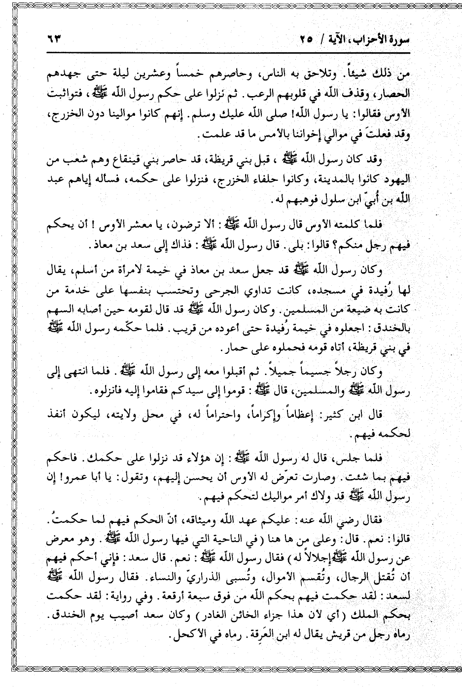 فلما جلس، قال له رسول الله صلّى الله عليه وسلّم: إن هؤلاء قد نزلوا على حكمك. فاحكم فيهم بما شئت. وصارت تعرّض له الأوس أن يحسن إليهم، وتقول: يا أبا عمرو! إن رسول الله صلّى الله عليه وسلّم قد ولاك أمر مواليك لتحكم فيهم.
