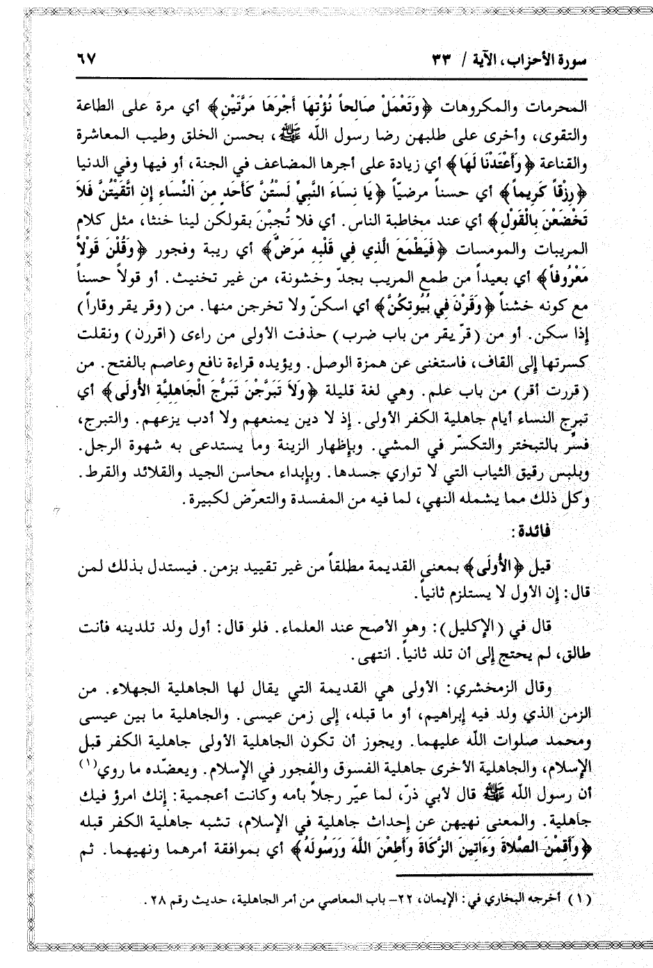 وقال الزمخشري: الأولى هي القديمة التي يقال لها الجاهلية الجهلاء. من الزمن الذي ولد فيه إبراهيم، أو ما قبله، إلى زمن عيسى. والجاهلية ما بين عيسى ومحمد صلوات الله عليهما. ويجوز أن تكون الجاهلية الأولى جاهلية الكفر قبل الإسلام، والجاهلية الأخرى جاهلية الفسوق والفجور في الإسلام. ويعضّده ما