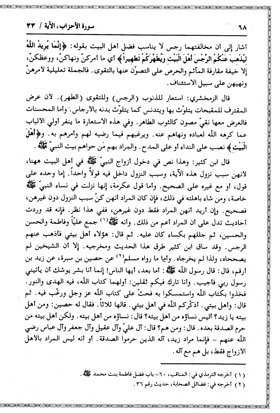 فخذوا بكتاب الله واستمسكوا به فحثّ على كتاب الله عز وجل ورغّب فيه. ثم قال: وأهل بيتي. أذكّركم الله في أهل بيتي. قالها ثلاثا. فقال له حصين: ومن أهل بيته يا زيد؟ أليس نساؤه من أهل بيته؟ قال: نساؤه من أهل بيته. ولكن أهل بيته من حرم الصدقة بعده. قال: ومن هم؟ قال: آل عليّ وآل عقيل وآل جعفر وآل عباس رضي الله عنهم