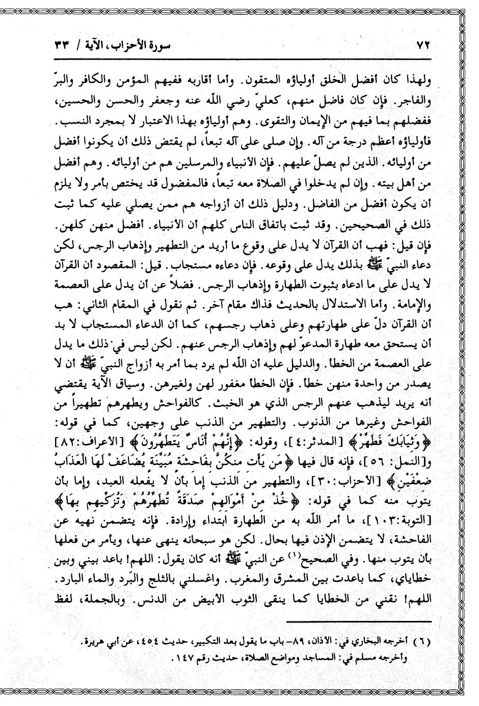 فإن قيل: فهب أن القرآن لا يدل على وقوع ما أريد من التطهير وإذهاب الرجس، لكن دعاء النبيّ صلى الله عليه وسلّم بذلك يدل على وقوعه. فإن دعاءه مستجاب. قيل: المقصود أن القرآن لا يدل على ما ادعاه بثبوت الطهارة وإذهاب الرجس. فضلا عن أن يدل على العصمة والإمامة. وأما الاستدلال بالحديث فذاك مقام آخر. ثم نقول في المقام الثاني: هب أن القرآن دلّ على طهارتهم وعلى ذهاب رجسهم، كما أن الدعاء المستجاب لا بد أن يستحق معه طهارة المدعوّ لهم وإذهاب الرجس عنهم. لكن ليس في ذلك ما يدل على العصمة من الخطأ. والدليل عليه أن الله لم يرد بما أمر به أزواج النبيّ صلى الله عليه وسلّم أن لا يصدر من واحدة منهن خطأ. فإن الخطأ مغفور لهن ولغيرهن. وسياق الآية يقتضي أنه يريد ليذهب عنهم الرجس الذي هو الخبث. كالفواحش ويطهرهم تطهيرا من الفواحش وغيرها من الذنوب. والتطهير من الذنب على وجهين، كما في قوله: