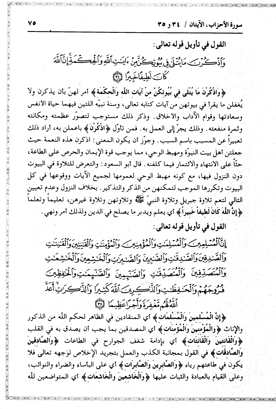 إِنَّ الْمُسْلِمِينَ وَالْمُسْلِماتِ وَالْمُؤْمِنِينَ وَالْمُؤْمِناتِ وَالْقانِتِينَ وَالْقانِتاتِ وَالصَّادِقِينَ وَالصَّادِقاتِ وَالصَّابِرِينَ وَالصَّابِراتِ وَالْخاشِعِينَ وَالْخاشِعاتِ وَالْمُتَصَدِّقِينَ وَالْمُتَصَدِّقاتِ وَالصَّائِمِينَ وَالصَّائِماتِ وَالْحافِظِينَ فُرُوجَهُمْ وَالْحافِظاتِ وَالذَّاكِرِينَ اللَّهَ كَثِيراً وَالذَّاكِراتِ أَعَدَّ اللَّهُ لَهُمْ مَغْفِرَةً وَأَجْراً عَظِيماً (35)