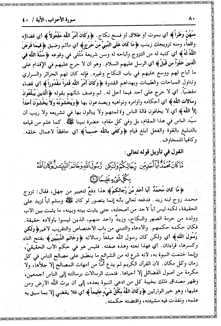 ما كانَ مُحَمَّدٌ أَبا أَحَدٍ مِنْ رِجالِكُمْ وَلكِنْ رَسُولَ اللَّهِ وَخاتَمَ النَّبِيِّينَ وَكانَ اللَّهُ بِكُلِّ شَيْءٍ عَلِيماً (40)