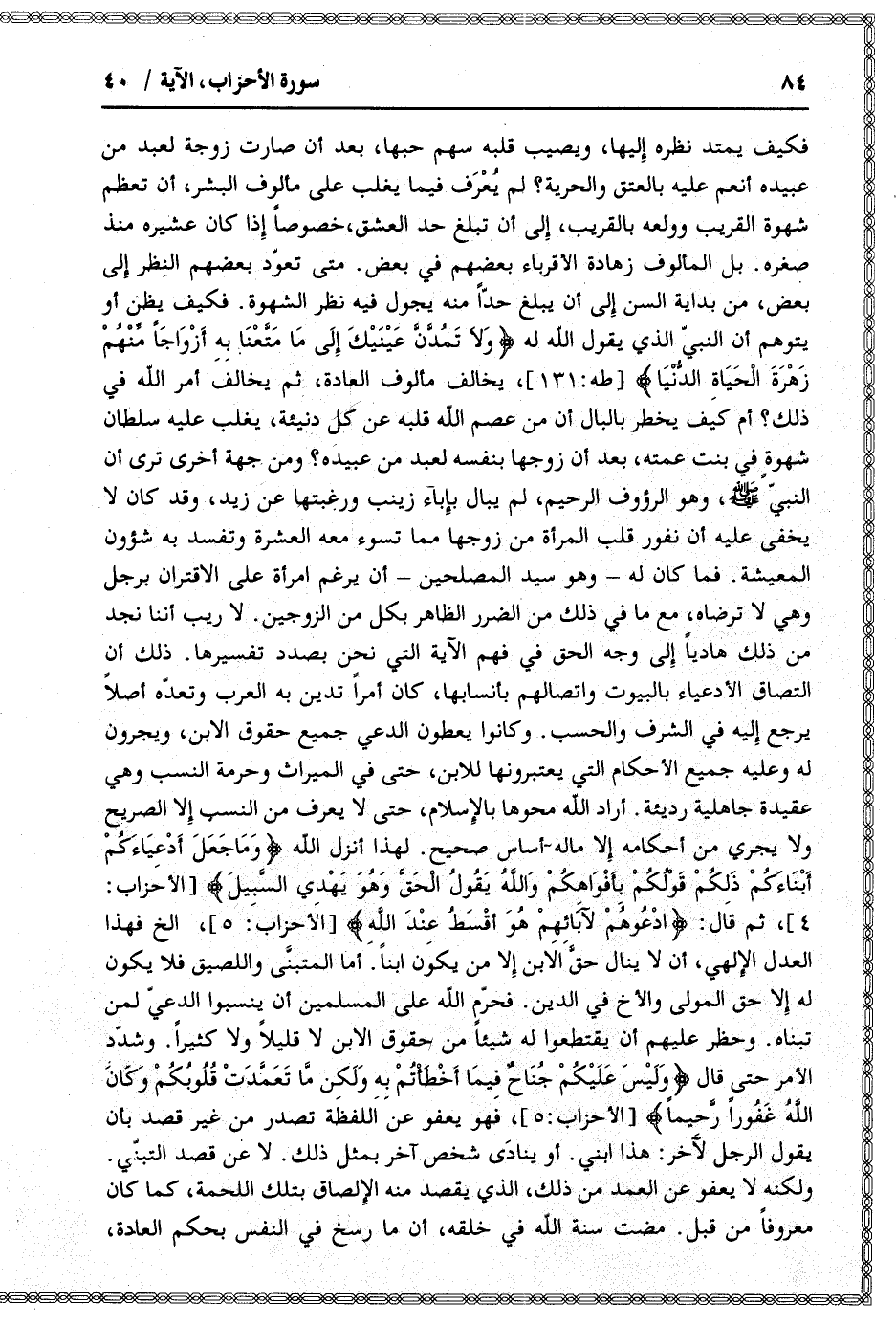4] ، ثم قال: ادْعُوهُمْ لِآبائِهِمْ هُوَ أَقْسَطُ عِنْدَ اللَّهِ [الأحزاب: 5] ، إلخ فهذا العدل الإلهي، أن لا ينال حقّ الابن إلا من يكون ابنا. أما المتبنّى واللصيق فلا يكون له إلا حق المولى والأخ في الدين. فحرّم الله على المسلمين أن ينسبوا الدعيّ لمن تبناه. وحظر عليهم أن يقتطعوا له شيئا من حقوق الابن لا قليلا ولا كثيرا. وشدّد الأمر حتى قال وَلَيْسَ عَلَيْكُمْ جُناحٌ فِيما أَخْطَأْتُمْ بِهِ وَلكِنْ ما تَعَمَّدَتْ قُلُوبُكُمْ وَكانَ اللَّهُ غَفُوراً رَحِيماً [الأحزاب: 5] ، فهو يعفو عن اللفظة تصدر من غير قصد بأن يقول الرجل لآخر: هذا ابني. أو ينادى شخص آخر بمثل ذلك. لا عن قصد التبنّي.