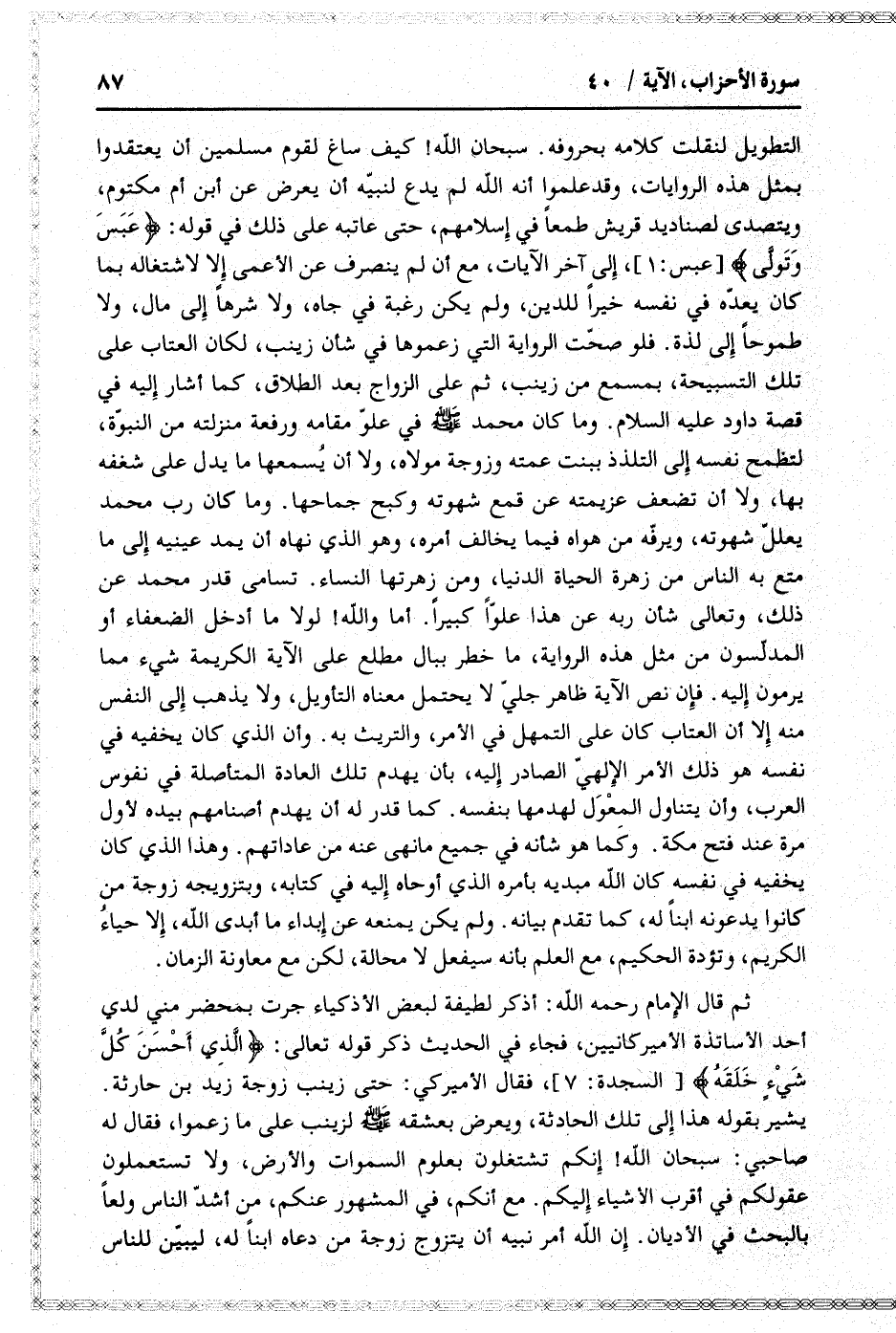 يشير بقوله هذا إلى تلك الحادثة، ويعرض بعشقه صلّى الله عليه وسلّم لزينب على ما زعموا، فقال له صاحبي: سبحان الله! إنكم تشتغلون بعلوم السموات والأرض، ولا تستعملون عقولكم في أقرب الأشياء إليكم. مع أنكم، في المشهور عنكم، من أشدّ الناس ولعا بالبحث في الأديان. إن الله أمر نبيه أن يتزوج زوجة من دعاه ابنا له، ليبيّن للناس