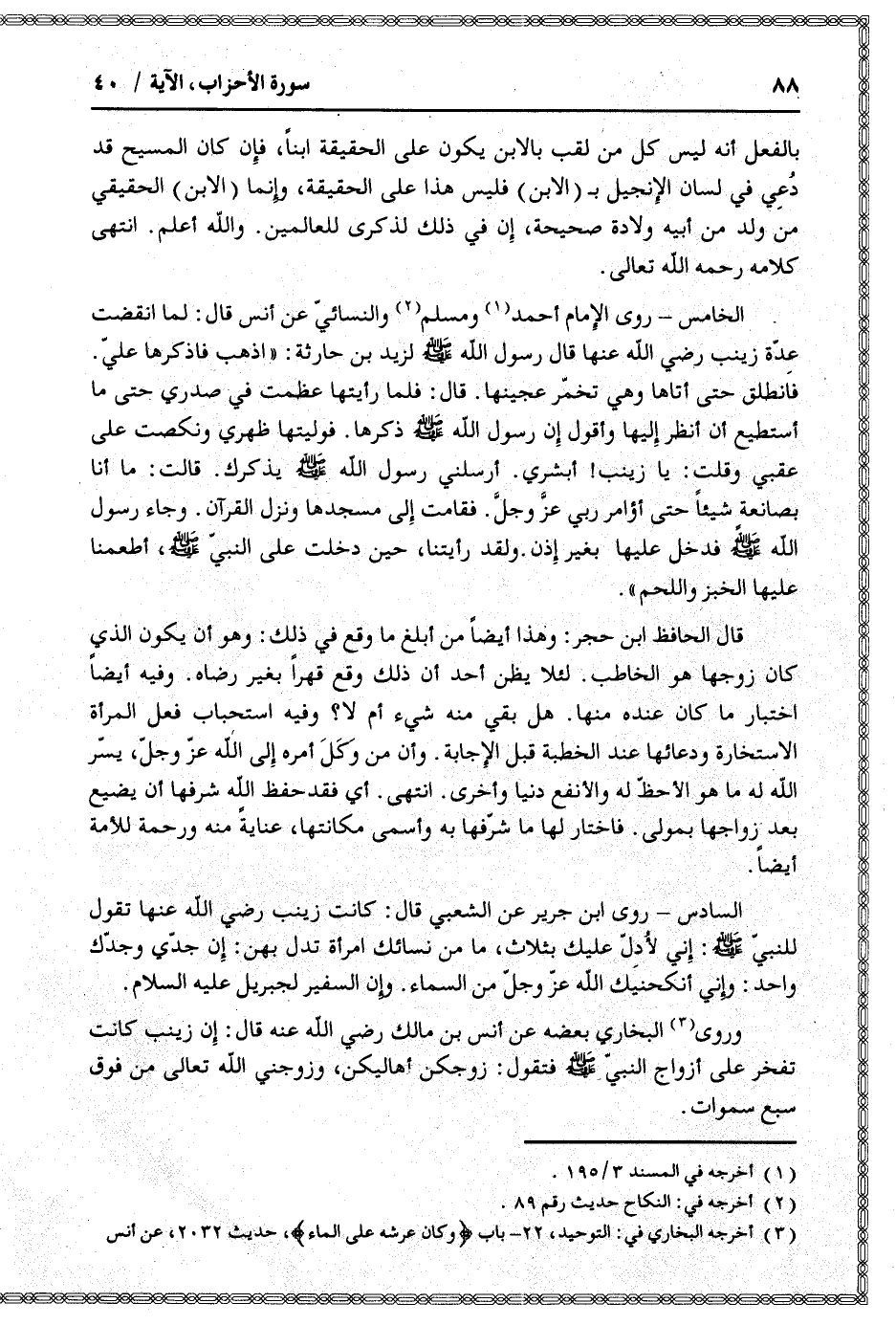 السادس- روى ابن جرير عن الشعبي قال: كانت زينب رضي الله عنها تقول للنبيّ صلّى الله عليه وسلّم: إني لأدلّ عليك بثلاث، ما من نسائك امرأة تدل بهن: إن جدّي وجدّك واحد: وإني أنكحنيك الله عزّ وجلّ من السماء. وإن السفير لجبريل عليه السلام.