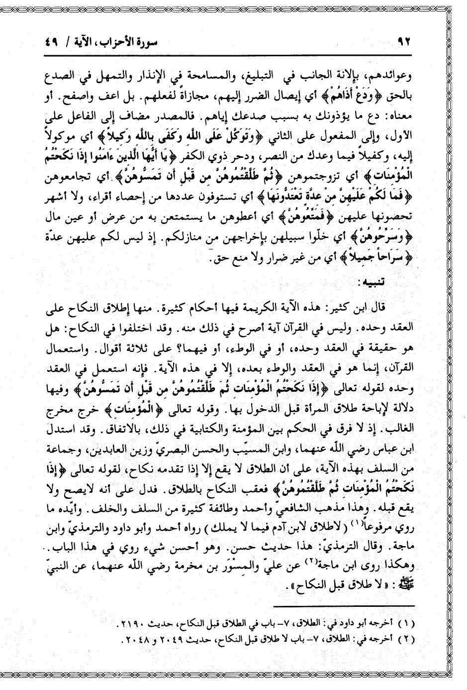 وعوائدهم، بإلانة الجانب في التبليغ، والمسامحة في الإنذار والتمهل في الصدع بالحق وَدَعْ أَذاهُمْ أي إيصال الضرر إليهم، مجازاة لفعلهم. بل اعف واصفح. أو معناه: دع ما يؤذونك به بسبب صدعك إياهم. فالمصدر مضاف إلى الفاعل على الأول، وإلى المفعول على الثاني وَتَوَكَّلْ عَلَى اللَّهِ وَكَفى بِاللَّهِ وَكِيلًا أي موكولا إليه، وكفيلا فيما وعدك من النصر، ودحر ذوي الكفر يا أَيُّهَا الَّذِينَ آمَنُوا إِذا نَكَحْتُمُ الْمُؤْمِناتِ أي تزوجتموهن ثُمَّ طَلَّقْتُمُوهُنَّ مِنْ قَبْلِ أَنْ تَمَسُّوهُنَّ أي تجامعوهن فَما لَكُمْ عَلَيْهِنَّ مِنْ عِدَّةٍ تَعْتَدُّونَها أي تستوفون عددها من إحصاء أقراء، ولا أشهر تحصونها عليهن فَمَتِّعُوهُنَّ أي أعطوهن ما يستمتعن به من عرض أو عين مال وَسَرِّحُوهُنَّ أي خلّوا سبيلهن بإخراجهن من منازلكم. إذ ليس لكم عليهن عدّة سَراحاً جَمِيلًا أي من غير ضرار ولا منع حق.