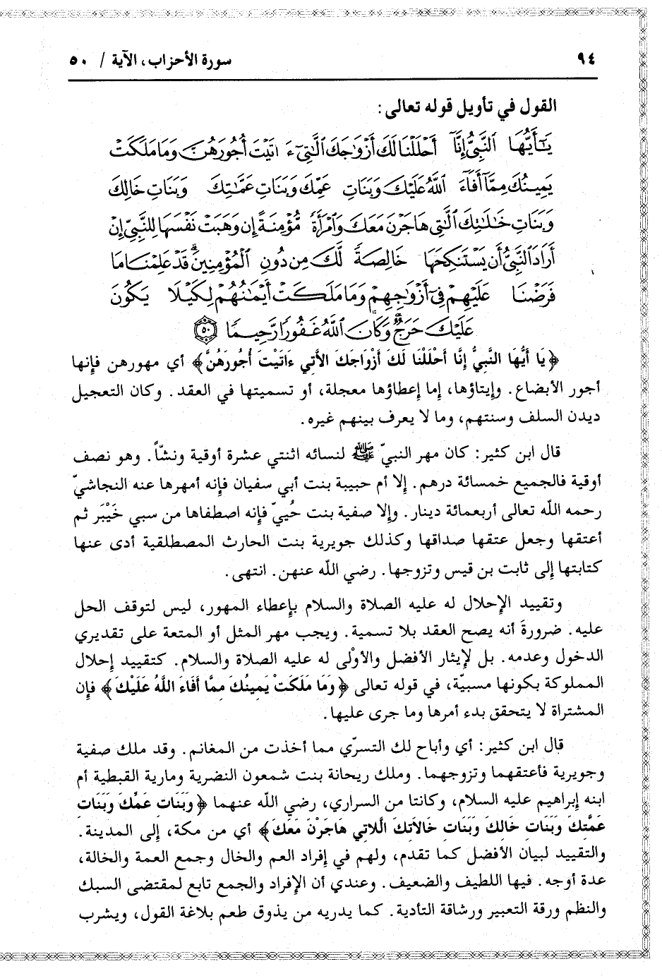 يا أَيُّهَا النَّبِيُّ إِنَّا أَحْلَلْنا لَكَ أَزْواجَكَ اللاَّتِي آتَيْتَ أُجُورَهُنَّ وَما مَلَكَتْ يَمِينُكَ مِمَّا أَفاءَ اللَّهُ عَلَيْكَ وَبَناتِ عَمِّكَ وَبَناتِ عَمَّاتِكَ وَبَناتِ خالِكَ وَبَناتِ خالاتِكَ اللاَّتِي هاجَرْنَ مَعَكَ وَامْرَأَةً مُؤْمِنَةً إِنْ وَهَبَتْ نَفْسَها لِلنَّبِيِّ إِنْ أَرادَ النَّبِيُّ أَنْ يَسْتَنْكِحَها خالِصَةً لَكَ مِنْ دُونِ الْمُؤْمِنِينَ قَدْ عَلِمْنا ما فَرَضْنا عَلَيْهِمْ فِي أَزْواجِهِمْ وَما مَلَكَتْ أَيْمانُهُمْ لِكَيْلا يَكُونَ عَلَيْكَ حَرَجٌ وَكانَ اللَّهُ غَفُوراً رَحِيماً (50)