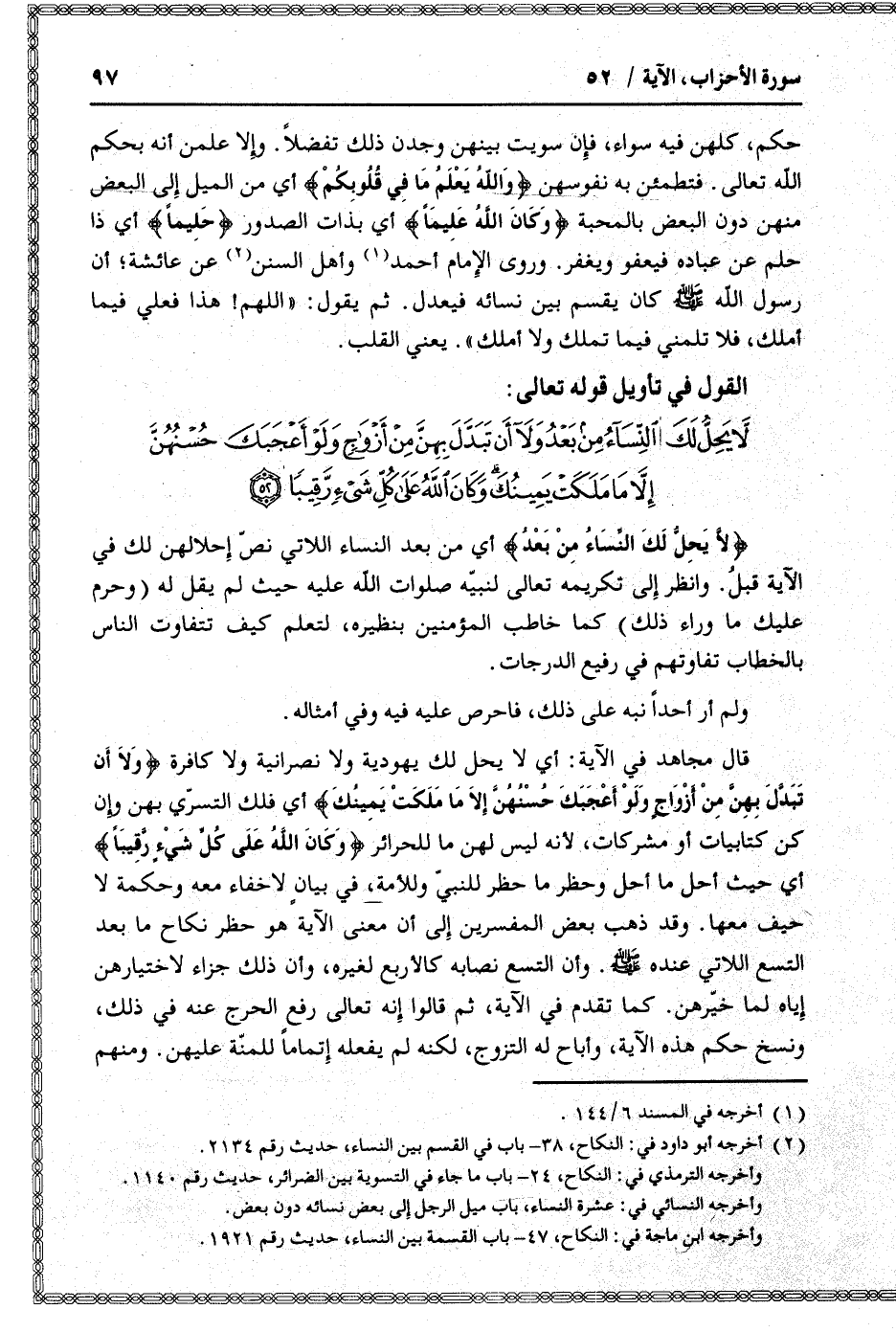 لا يَحِلُّ لَكَ النِّساءُ مِنْ بَعْدُ وَلا أَنْ تَبَدَّلَ بِهِنَّ مِنْ أَزْواجٍ وَلَوْ أَعْجَبَكَ حُسْنُهُنَّ إِلاَّ ما مَلَكَتْ يَمِينُكَ وَكانَ اللَّهُ عَلى كُلِّ شَيْءٍ رَقِيباً (52)
