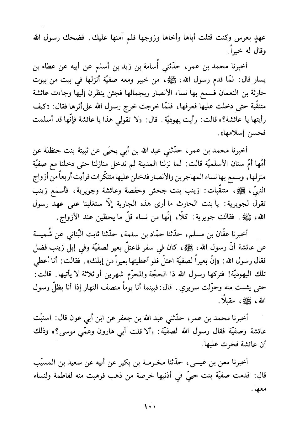 أَخْبَرَنَا مُحَمَّدُ بْنُ عُمَرَ. حَدَّثَنِي عَبْدُ اللَّهِ بْنُ أَبِي يَحْيَى عَنْ ثُبَيْتَةَ بِنْتِ حَنْظَلَةَ عَنْ أُمِّهَا أُمِّ سِنَانٍ الأَسْلَمِيَّةِ قَالَتْ: لَمَّا نَزَلْنَا الْمَدِينَةَ لَمْ نَدْخُلْ مَنَازِلَنَا حَتَّى دَخَلْنَا مَعَ صَفِيَّةَ مَنْزِلَهَا. وَسَمِعَ بِهَا نِسَاءُ الْمُهَاجِرِينَ وَالأَنْصَارِ فَدَخَلْنَ عَلَيْهَا مُتَنَكِّرَاتٍ فَرَأَيْتُ أَرْبَعًا مِنْ أَزْوَاجِ النَّبِيِّ - صَلَّى اللَّهُ عَلَيْهِ وَسَلَّمَ - مُتَنَقِّبَاتٍ: زَيْنَبَ بِنْتَ جَحْشٍ وَحَفْصَةَ وَعَائِشَةَ وَجُوَيْرِيَةَ. فَأَسْمَعُ زَيْنَبَ تَقُولُ لِجُوَيْرِيَةَ: يَا بِنْتَ الْحَارِثِ مَا أَرَى هَذِهِ الْجَارِيَةَ إِلا سَتَغْلِبُنَا عَلَى عَهْدِ رَسُولِ اللَّهِ - صَلَّى اللَّهُ عَلَيْهِ وَسَلَّمَ - فَقَالَتْ جُوَيْرِيَةُ: كَلا. إِنَّهَا مِنْ نِسَاءٍ قَلَّ مَا يُحْظَيْنَ عِنْدَ الأَزْوَاجِ.