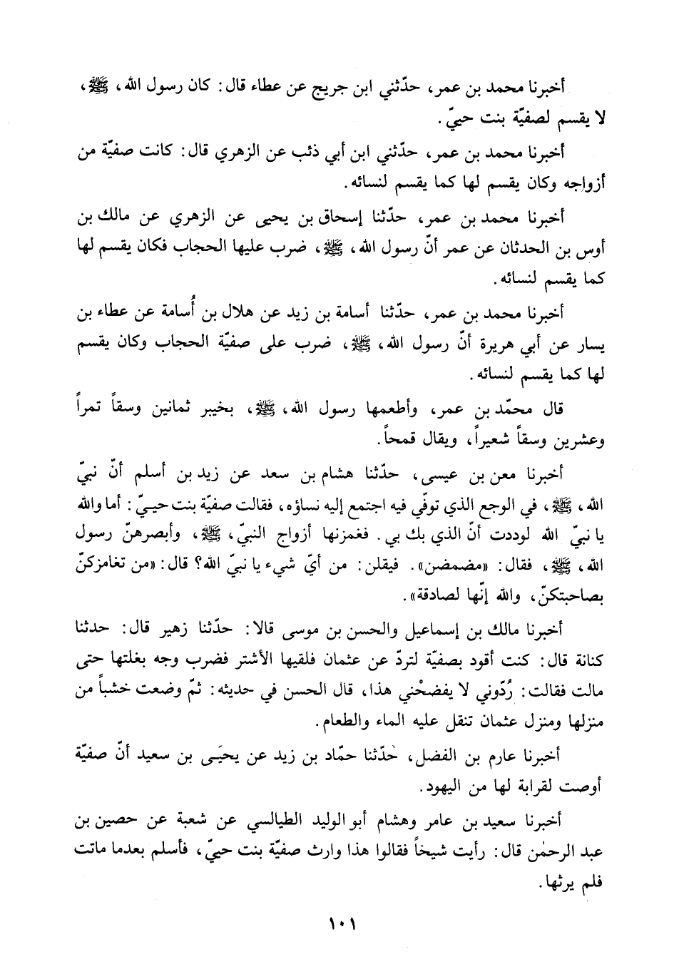 أَخْبَرَنَا سَعِيدُ بْنُ عَامِرٍ وَهِشَامٌ أَبُو الوليد الطيالسي عَنْ شُعْبَةَ عَنِ حُصَيْنِ بْنِ عَبْدِ الرَّحْمَنِ قَالَ: رَأَيْتُ شَيْخًا فَقَالُوا هَذَا وَارِثُ صَفِيَّةَ بِنْتِ حُيَيٍّ. فأسلم بعد ما مَاتَتْ فَلَمْ يَرِثْهَا.