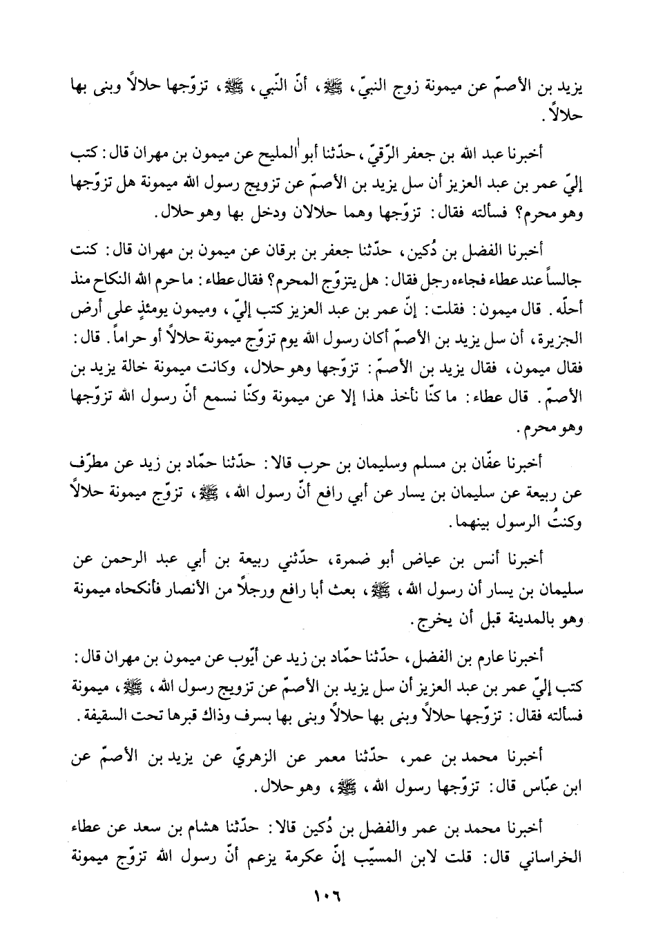 يَزِيدَ بْنِ الأَصَمِّ عَنْ مَيْمُونَةَ زَوْجِ النَّبِيِّ - صَلَّى اللَّهُ عَلَيْهِ وَسَلَّمَ - أَنَّ النَّبِيَّ - صَلَّى اللَّهُ عَلَيْهِ وَسَلَّمَ - تَزَوَّجَهَا حَلالا وَبَنَى بِهَا حَلالا.