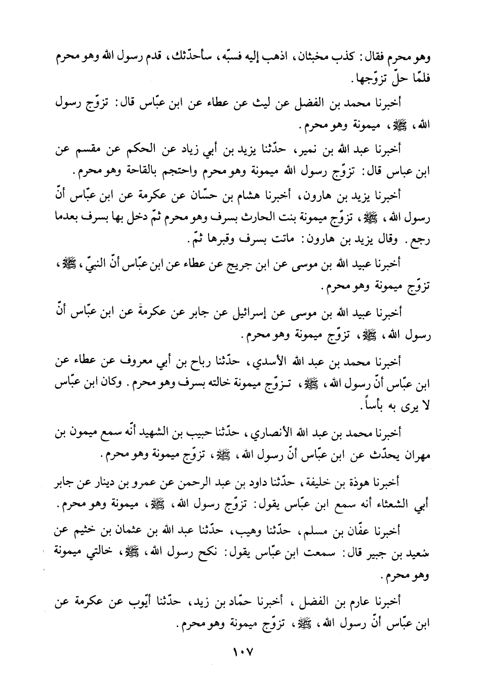 أَخْبَرَنَا يَزِيدُ بْنُ هَارُونَ. أَخْبَرَنَا هِشَامُ بْنُ حَسَّانَ عَنْ عِكْرِمَةَ عَنِ ابْنِ عَبَّاسٍ أَنَّ رَسُولَ اللَّهِ - صَلَّى اللَّهُ عَلَيْهِ وَسَلَّمَ - تَزَوَّجَ مَيْمُونَةَ بِنْتَ الْحَارِثِ بِسَرِفَ وَهُوَ مُحْرِمٌ ثُمَّ دَخَلَ بِهَا بِسَرِفَ بعد ما رَجَعَ. وَقَالَ يَزِيدُ بْنُ هَارُونَ: مَاتَتْ بِسَرِفَ وَقَبْرُهَا ثَمَّ.