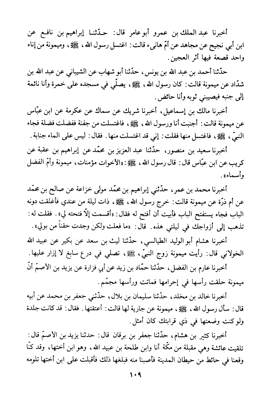 حَدَّثَنَا أَحْمَدُ بْنُ عَبْدِ اللَّهِ بْنِ يُونُسَ. حَدَّثَنَا أَبُو شِهَابٍ عَنِ الشَّيْبَانِيِّ عَنْ عَبْدِ اللَّهِ بْنِ شَدَّادٍ عَنْ مَيْمُونَةَ قَالَتْ: كَانَ رَسُولُ اللَّهِ - صَلَّى اللَّهُ عَلَيْهِ وَسَلَّمَ - يُصَلِّي فِي مَسْجِدِهِ عَلَى خُمْرَةٍ وَأَنَا نَائِمَةٌ إِلَى جَنْبِهِ فَيُصِيبُنِي ثَوْبُهُ وَأَنَا حَائِضٌ.