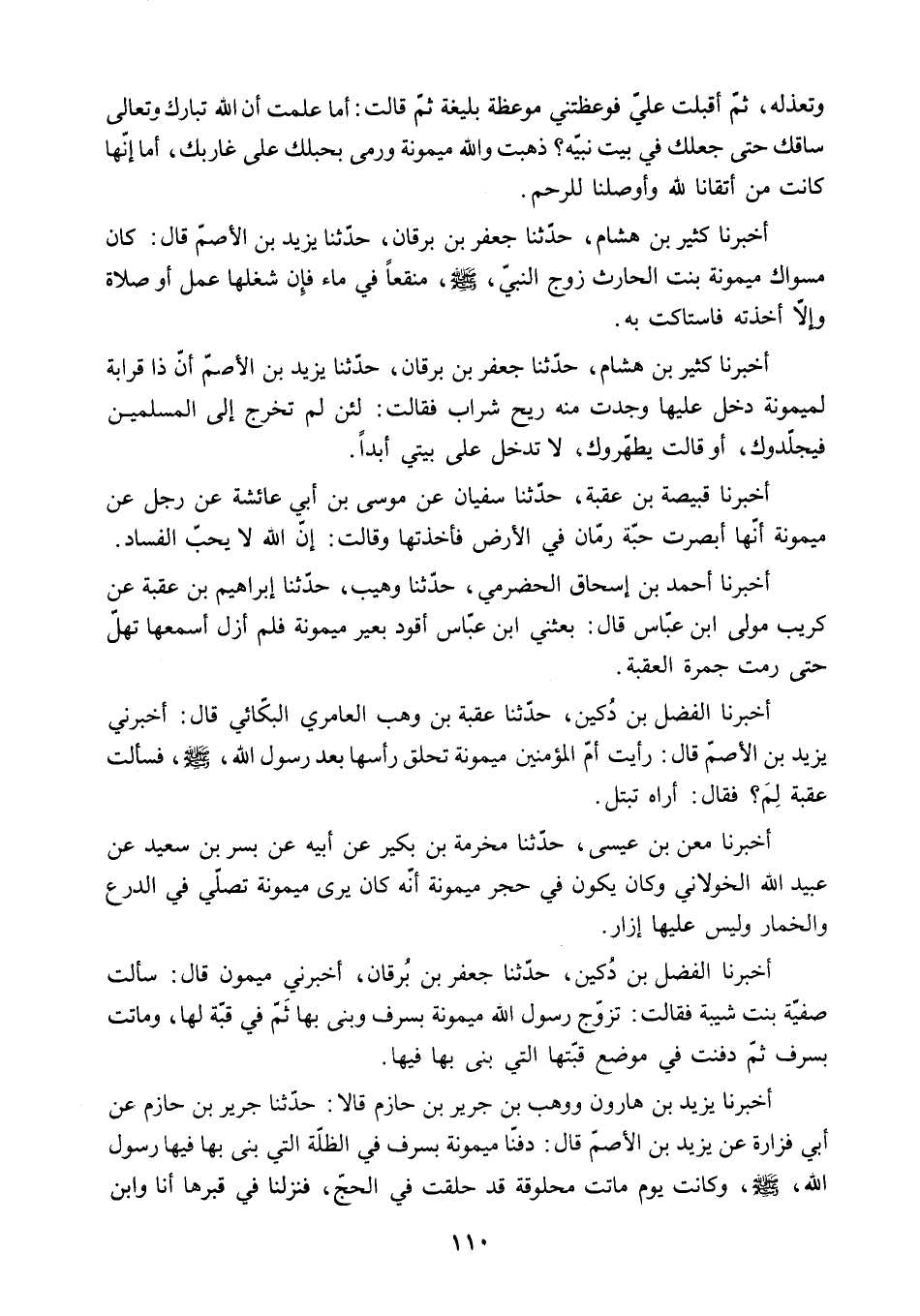 وَتَعْذِلُهُ. ثُمَّ أَقْبَلَتْ عَلَيَّ فَوَعَظَتْنِي مَوْعِظَةً بَلِيغَةً ثُمَّ قَالَتْ: أَمَا عَلِمْتَ أَنَّ اللَّهَ تَبَارَكَ وَتَعَالَى سَاقَكَ حَتَّى جَعَلَكَ فِي بَيْتِ نَبِيِّهِ؟ ذَهَبَتْ وَاللَّهِ مَيْمُونَةُ وَرَمَى بِحَبْلِكَ عَلَى غَارِبِكَ. أَمَا إِنَّهَا كَانَتْ مِنْ أَتْقَانَا لِلَّهِ وَأَوْصَلِنَا لِلرَّحِمِ.