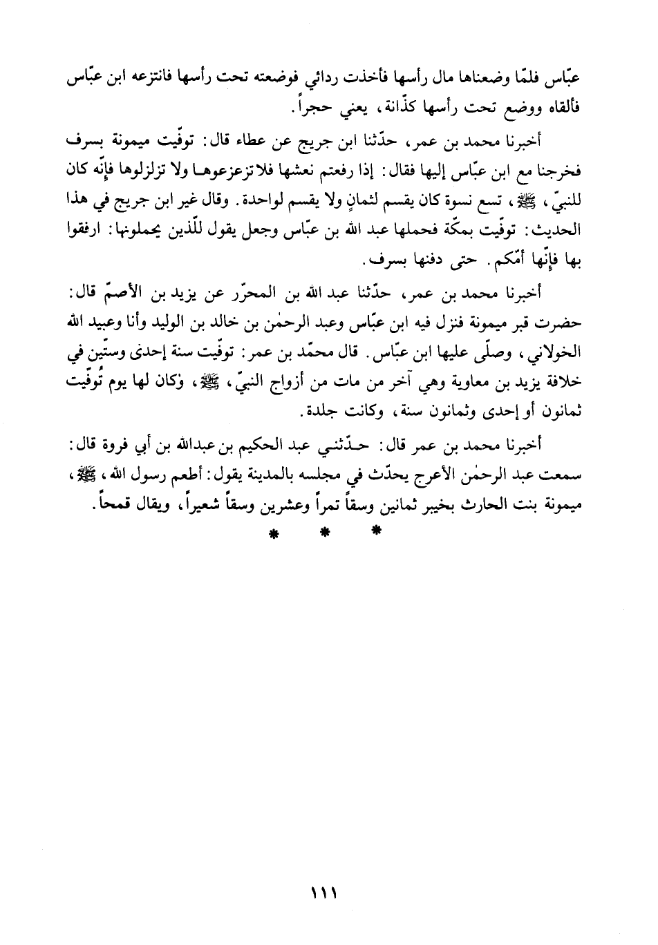 أَخْبَرَنَا مُحَمَّدُ بْنُ عُمَرَ. حَدَّثَنَا ابْنُ جُرَيْجٍ عَنْ عَطَاءٍ قَالَ: تُوُفِّيَتْ مَيْمُونَةُ بِسَرِفَ فَخَرَجْنَا مَعَ ابْنِ عَبَّاسٍ إِلَيْهَا فَقَالَ: إِذَا رَفَعْتُمْ نَعْشَهَا فَلا تُزَعْزِعُوهَا وَلا تُزَلْزِلُوهَا فَإِنَّهُ كَانَ لِلنَّبِيِّ - صَلَّى اللَّهُ عَلَيْهِ وَسَلَّمَ - تِسْعُ نِسْوَةٍ كَانَ يَقْسِمُ لِثَمَانٍ وَلا يَقْسِمُ لِوَاحِدَةٍ. وَقَالَ غَيْرُ ابْنِ جُرَيْجٍ فِي هَذَا الْحَدِيثِ: تُوُفِّيَتْ بِمَكَّةَ فَحَمَلَهَا عَبْدُ اللَّهِ بْنُ عَبَّاسٍ وَجَعَلَ يَقُولُ لِلَّذِينَ يَحْمِلُونَهَا: ارْفُقُوا بِهَا فَإِنَّهَا أُمُّكُمْ. حَتَّى دَفَنَهَا بِسَرِفَ.