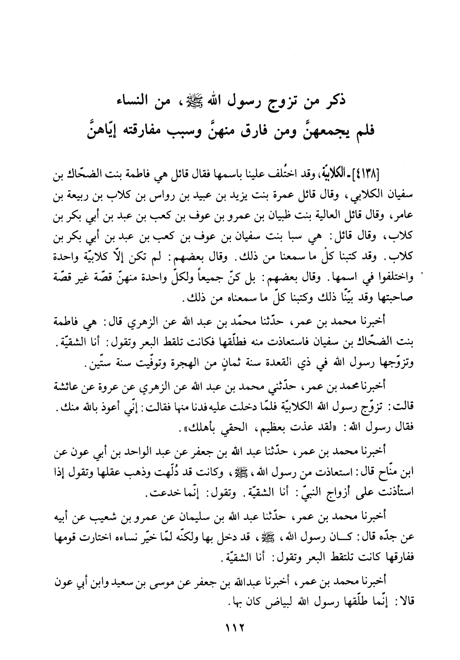 أَخْبَرَنَا مُحَمَّدُ بْنُ عُمَرَ. حَدَّثَنِي مُحَمَّدُ بْنُ عَبْدِ اللَّهِ عَنِ الزُّهْرِيِّ عَنْ عُرْوَةَ عَنْ عَائِشَةَ [قَالَتْ: تَزَوَّجَ رَسُولُ اللَّهِ الْكِلابِيَّةَ فَلَمَّا دَخَلَتْ عَلَيْهِ فدنا منها فقالت: إِنِّي أَعُوذُ بِاللَّهِ مِنْكَ.