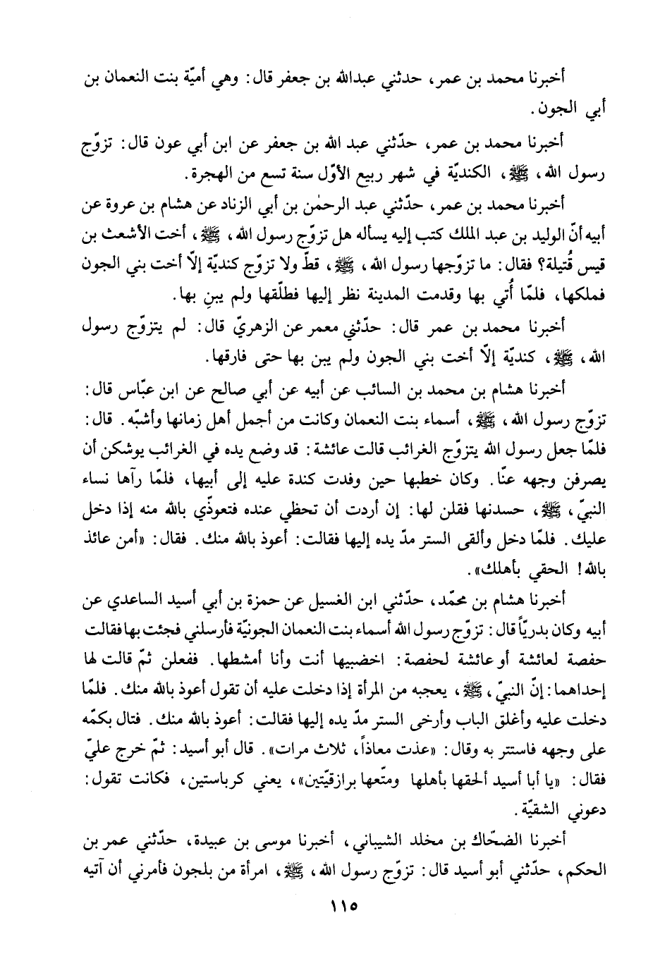 أَخْبَرَنَا مُحَمَّدُ بْنُ عُمَرَ. حَدَّثَنِي عَبْدُ الرَّحْمَنِ بْنُ أَبِي الزِّنَادِ عَنْ هِشَامِ بْنِ عُرْوَةَ عَنْ أَبِيهِ أَنَّ الْوَلِيدَ بْنَ عَبْدِ الْمَلِكِ كَتَبَ إِلَيْهِ يَسْأَلُهُ هَلْ تَزَوَّجَ رَسُولُ اللَّهِ - صَلَّى اللَّهُ عَلَيْهِ وَسَلَّمَ - أُخْتَ الأَشْعَثَ بْنِ قَيْسٍ قُتَيْلَةَ؟ فَقَالَ: مَا تَزَوَّجَهَا رَسُولِ اللَّهِ - صَلَّى اللَّهُ عَلَيْهِ وَسَلَّمَ - قَطُّ وَلا تَزَوَّجَ كِنْدِيَّةً إِلا أُخْتَ بَنِي الْجَوْنِ فَمَلَكَهَا. فَلَمَّا أُتِيَ بِهَا وَقَدِمَتِ الْمَدِينَةَ نَظَرَ إِلَيْهَا فَطَلَّقَهَا وَلَمْ يَبْنِ بِهَا.