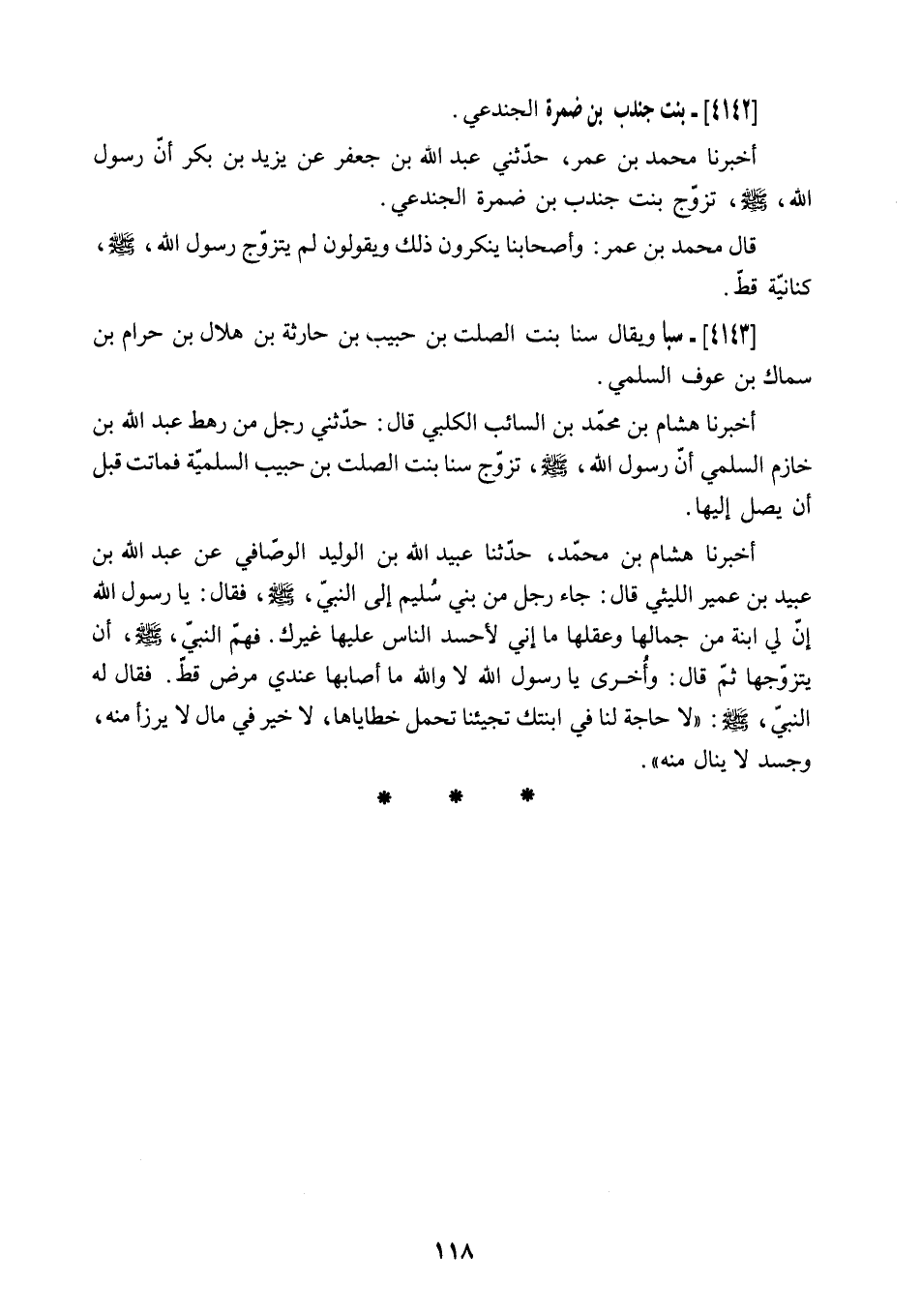 أَخْبَرَنَا هِشَامُ بْنُ مُحَمَّدٍ. حَدَّثَنَا عُبَيْدُ اللَّهِ بْنُ الْوَلِيدِ الْوَصَّافِيُّ عَنْ عَبْدِ اللَّهِ بْنِ عُبَيْدِ بْنِ عُمَيْرٍ اللَّيْثِيِّ قَالَ: جَاءَ رَجُلٌ مِنْ بَنِي سُلَيْمٍ إِلَى النَّبِيِّ - صَلَّى اللَّهُ عَلَيْهِ وَسَلَّمَ - فَقَالَ: يَا رَسُولَ اللَّهِ إِنَّ لِي ابْنَةً مِنْ جَمَالِهَا وَعَقْلِهَا مَا إِنِّي لأَحْسُدُ النَّاسَ عَلَيْهَا غَيْرَكَ. فَهَمَّ النَّبِيُّ - صَلَّى اللَّهُ عَلَيْهِ وَسَلَّمَ - أَنْ يَتَزَوَّجَهَا ثُمَّ قَالَ: وَأُخْرَى يَا رَسُولَ اللَّهِ لا وَاللَّهِ مَا أَصَابَهَا عِنْدِي مرض قط. [فقال له النبي. ص: لا حَاجَةَ لَنَا فِي ابْنَتِكَ تَجِيئَنَا تَحْمِلُ خَطَايَاهَا. لا خَيْرَ فِي مَالٍ لا يُرْزَأُ مِنْهُ.
