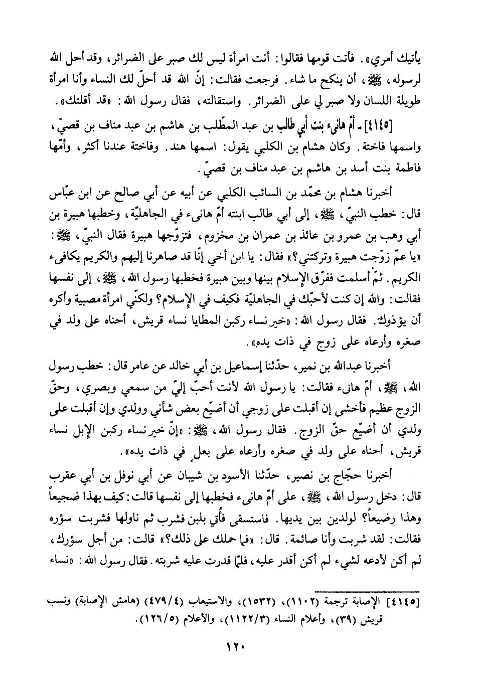 أَخْبَرَنَا عَبْدُ اللَّهِ بْنُ نُمَيْرٍ. حَدَّثَنَا إِسْمَاعِيلُ بْنُ أَبِي خَالِدٍ عَنْ عَامِرٍ قَالَ: خَطَبَ رَسُولُ اللَّهِ - صَلَّى اللَّهُ عَلَيْهِ وَسَلَّمَ - أُمَّ هَانِئٍ فَقَالَتْ: يَا رَسُولَ اللَّهِ لأَنْتَ أَحَبُّ إِلَيَّ مِنْ سَمْعِي وَبَصَرِي. وَحَقُّ الزَّوْجِ عَظِيمٌ فَأَخْشَى إِنْ أَقْبَلْتُ عَلَى زَوْجِي أَنْ أُضَيِّعَ بَعْضَ شَأْنِي وَوَلَدِي وَإِنْ أَقْبَلْتُ عَلَى وَلَدِي أَنْ أُضَيِّعَ حَقَّ الزَّوْجِ. [فَقَالَ رسول الله. ص: إِنَّ خَيْرَ نِسَاءٍ رَكِبْنَ الإِبِلَ نِسَاءُ قُرَيْشٍ. أَحْنَاهُ عَلَى وَلَدٍ فِي صِغَرِهِ وَأَرْعَاهُ عَلَى بَعْلٍ فِي ذَاتِ يَدِهِ] .