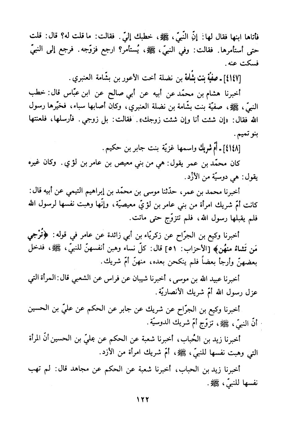 أَخْبَرَنَا وَكِيعُ بْنُ الْجَرَّاحِ عَنْ زَكَرِيَّاءَ بْنِ أبي زَائِدَةَ عَنْ عَامِرٍ فِي قَوْلِهِ: «تُرْجِي مَنْ تَشاءُ مِنْهُنَّ» الأحزاب: 51 قَالَ: كُلُّ نِسَاءٍ وَهَبْنَ أَنْفُسَهُنَّ لِلنَّبِيِّ - صَلَّى اللَّهُ عَلَيْهِ وَسَلَّمَ - فَدَخَلَ بَعْضُهُنَّ وَأَرْجَأَ بَعْضًا فَلَمْ يَنْكِحْنَ بَعْدَهُ. مِنْهُنَّ أُمُّ شَرِيكٍ.