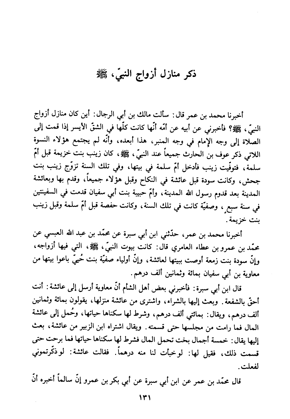 وأن سودة بنت زمعة أوصت ببيتها لعائشة. وأن أولياء صفية بنت حيي باعوا بيتها من معاوية بن أبي سفيان بمائة وثمانين ألف درهم.