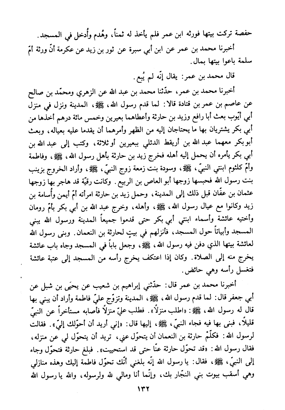 أَخْبَرَنَا مُحَمَّدُ بْنُ عُمَرَ قَالَ: حَدَّثَنِي إِبْرَاهِيمُ بْنُ شُعَيْبٍ عَنْ يَحْيَى بْنِ شِبْلٍ عَنْ [أَبِي جَعْفَرٍ قَالَ: لَمَّا قَدِمَ رَسُولُ اللَّهِ - صَلَّى اللَّهُ عَلَيْهِ وَسَلَّمَ - الْمَدِينَةَ وَتَزَوَّجَ عَلِيٌّ فَاطِمَةَ وَأَرَادَ أَنْ يَبْنِيَ بِهَا قَالَ لَهُ رَسُولُ اللَّهِ. ص: اطْلُبْ مَنْزِلا. فَطَلَبَ عَلِيٌّ مَنْزِلا فَأَصَابَهُ مُسْتَأْخِرًا عَنِ النَّبِيِّ قَلِيلا. فَبَنَى بِهَا فِيهِ فَجَاءَ النَّبِيُّ - صَلَّى اللَّهُ عَلَيْهِ وَسَلَّمَ - إِلَيْهَا قَالَ: إِنِّي أُرِيدُ أَنْ أُحَوِّلَكِ إِلَيَّ. فَقَالَتْ لِرَسُولِ اللَّهِ: فَكَلِّمْ حَارِثَةَ بْنَ النُّعْمَانِ أَنْ يَتَحَوَّلَ عَنِّي. تُرِيدُ أَنْ يَتَحَوَّلَ لِي عَنْ مَنْزِلِهِ.