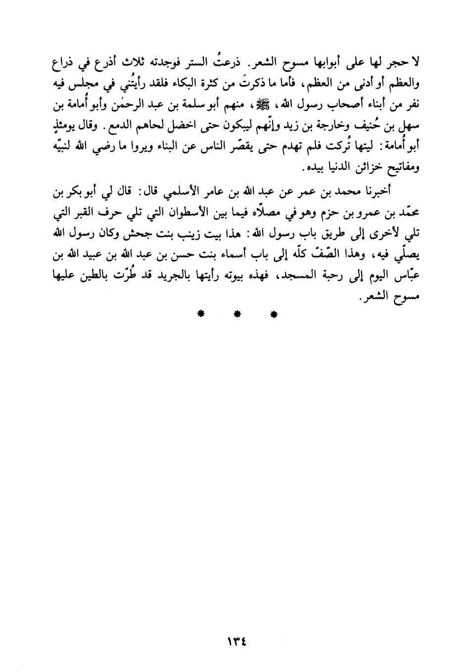 لا حُجَرَ لَهَا عَلَى أَبْوَابِهَا مُسُوحُ الشَّعْرِ. ذَرَعْتُ السِّتْرَ فَوَجَدْتُهُ ثَلاثَ أَذْرُعٍ فِي ذِرَاعٍ وَالْعَظْمِ أَوْ أَدْنَى مِنَ الْعَظْمِ. فَأَمَّا مَا ذَكَرْتُ مِنْ كَثْرَةِ الْبُكَاءِ فَلَقَدْ رَأَيْتُنِي فِي مَجْلِسٍ فِيهِ نَفَرٌ مِنْ أَبْنَاءِ أَصْحَابِ رَسُولِ اللَّهِ - صَلَّى اللَّهُ عَلَيْهِ وَسَلَّمَ - مِنْهُمْ أَبُو سَلَمَةَ بْنُ عَبْدِ الرَّحْمَنِ وَأَبُو أُمَامَةَ بْنُ سَهْلِ بْنِ حُنَيْفٍ وَخَارِجَةُ بْنُ زَيْدٍ وَإِنَّهُمْ لَيَبْكُونَ حَتَّى أَخْضَلَ لِحَاهُمُ الدَّمْعُ. وَقَالَ يَوْمَئِذٍ أَبُو أُمَامَةَ: لَيْتَهَا تُرِكَتْ فَلَمْ تُهْدَمْ حَتَّى يَقْصُرَ النَّاسُ عَنِ الْبِنَاءِ وَيَرَوْا مَا رَضِيَ اللَّهُ لِنَبِيِّهِ وَمَفَاتِيحُ خَزَائِنِ الدُّنْيَا بِيَدِهِ.