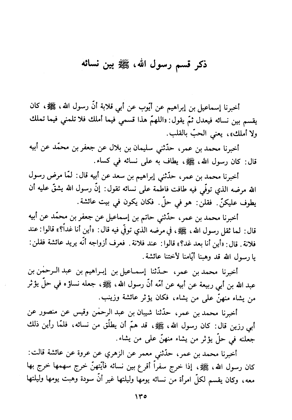 أَخْبَرَنَا إِسْمَاعِيلُ بْنُ إِبْرَاهِيمَ عَنْ أَيُّوبَ عَنْ أَبِي قِلابَةَ أَنَّ [رَسُولَ اللَّهِ - صَلَّى اللَّهُ عَلَيْهِ وَسَلَّمَ - كَانَ يَقْسِمُ بَيْنَ نِسَائِهِ فَيَعْدِلُ ثُمَّ يَقُولُ: اللَّهُمَّ هَذَا قَسْمِي فِيمَا أَمْلِكُ فَلا تَلُمْنِي فِيمَا تَمْلِكُ وَلا أَمْلِكُ. يَعْنِي الْحُبَّ بِالْقَلْبِ] .