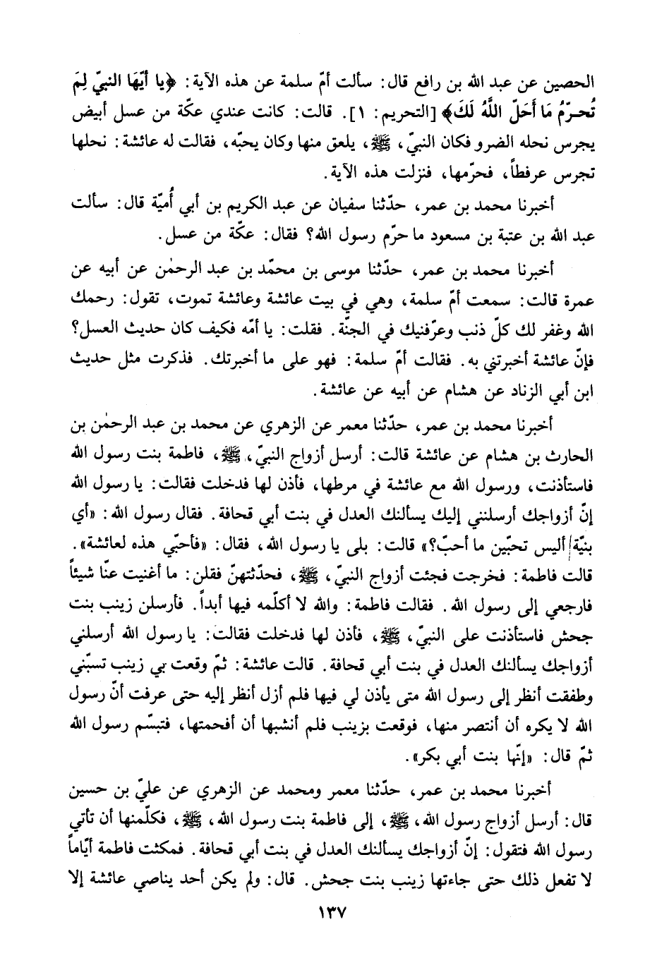 الْحُصَيْنِ عَنْ عَبْدِ اللَّهِ بْنِ رَافِعٍ قَالَ: سألت أم سلمة عن هذه الآية: «يا أَيُّهَا النَّبِيُّ لِمَ تُحَرِّمُ مَا أَحَلَّ اللَّهُ لَكَ» التحريم: 1. قَالَتْ: كَانَتْ عِنْدِي عُكَّةٌ مِنْ عَسَلٍ أَبْيَضَ يَجْرُسُ نَحْلُهُ الضُّرْوَ فَكَانَ النَّبِيُّ - صَلَّى اللَّهُ عَلَيْهِ وَسَلَّمَ - يَلْعَقُ مِنْهَا وَكَانَ يُحِبُّهُ. فَقَالَتْ لَهُ عَائِشَةُ: نَحْلُهَا تَجْرُسُ عُرْفُطًا. فَحَرَّمَهَا. فَنَزَلَتْ هَذِهِ الآيَةُ.