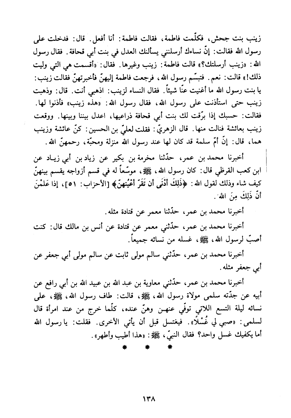 أَخْبَرَنَا مُحَمَّدُ بْنُ عُمَرَ. حَدَّثَنِي مُعَاوِيَةُ بْنُ عَبْدِ اللَّهِ بْنِ عُبَيْدِ اللَّهِ بْنِ أَبِي رَافِعٍ عَنْ أَبِيهِ عَنْ جَدَّتِهِ [سَلْمَى مَوْلاةِ رَسُولِ اللَّهِ - صَلَّى اللَّهُ عَلَيْهِ وَسَلَّمَ - قَالَتْ: طَافَ رَسُول اللَّهِ - صَلَّى اللَّهُ عَلَيْهِ وَسَلَّمَ - عَلَى نِسَائِهِ لَيْلَةَ التِّسْعِ اللاتِي تُوُفِّيَ عَنْهُنَّ وَهُنَّ عِنْدَهُ. كُلَّمَا خَرَجَ مِنْ عِنْدِ امْرَأَةٍ قَالَ لِسَلْمَى: صبي لي غسلا. فيغتسل قبل أن يأتي الأُخْرَى. فَقُلْتُ: يَا رَسُولَ اللَّهِ أَمَا يَكْفِيكَ غسل واحد؟ فقال النبي. ص: هَذَا أَطْيَبُ وَأَطْهَرُ] .