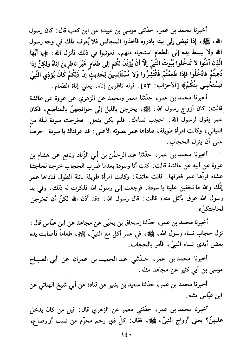 أَخْبَرَنَا مُحَمَّدُ بْنُ عُمَرَ. حَدَّثَنِي مُوسَى بْنُ عُبَيْدَةَ عَنِ ابْنِ كَعْبٍ قَالَ: كَانَ رَسُولُ اللَّهِ - صَلَّى اللَّهُ عَلَيْهِ وسلم - إِذَا نَهَضَ إِلَى بَيْتِهِ بَادَرُوهُ فَأَخَذُوا الْمَجَالِسَ فَلا يُعْرَفُ ذَلِكَ فِي وَجْهِ رَسُولِ اللَّهِ وَلا يَبْسُطُ يَدَهُ إِلَى الطَّعَامِ اسْتِحْيَاءً مِنْهُمْ. فعوتبوا في ذلك فأنزل الله: «يا أَيُّهَا الَّذِينَ آمَنُوا لا تَدْخُلُوا بُيُوتَ النَّبِيِّ إِلَّا أَنْ يُؤْذَنَ لَكُمْ إِلى طَعامٍ غَيْرَ ناظِرِينَ إِناهُ وَلكِنْ إِذا دُعِيتُمْ فَادْخُلُوا فَإِذا طَعِمْتُمْ فَانْتَشِرُوا وَلا مُسْتَأْنِسِينَ لِحَدِيثٍ إِنَّ ذلِكُمْ كانَ يُؤْذِي النَّبِيَّ فَيَسْتَحْيِي مِنْكُمْ» الأحزاب: 53. قَوْلُهُ نَاظِرِينَ إِنَاهُ. يَعْنِي إِنَاةَ الطَّعَامِ.